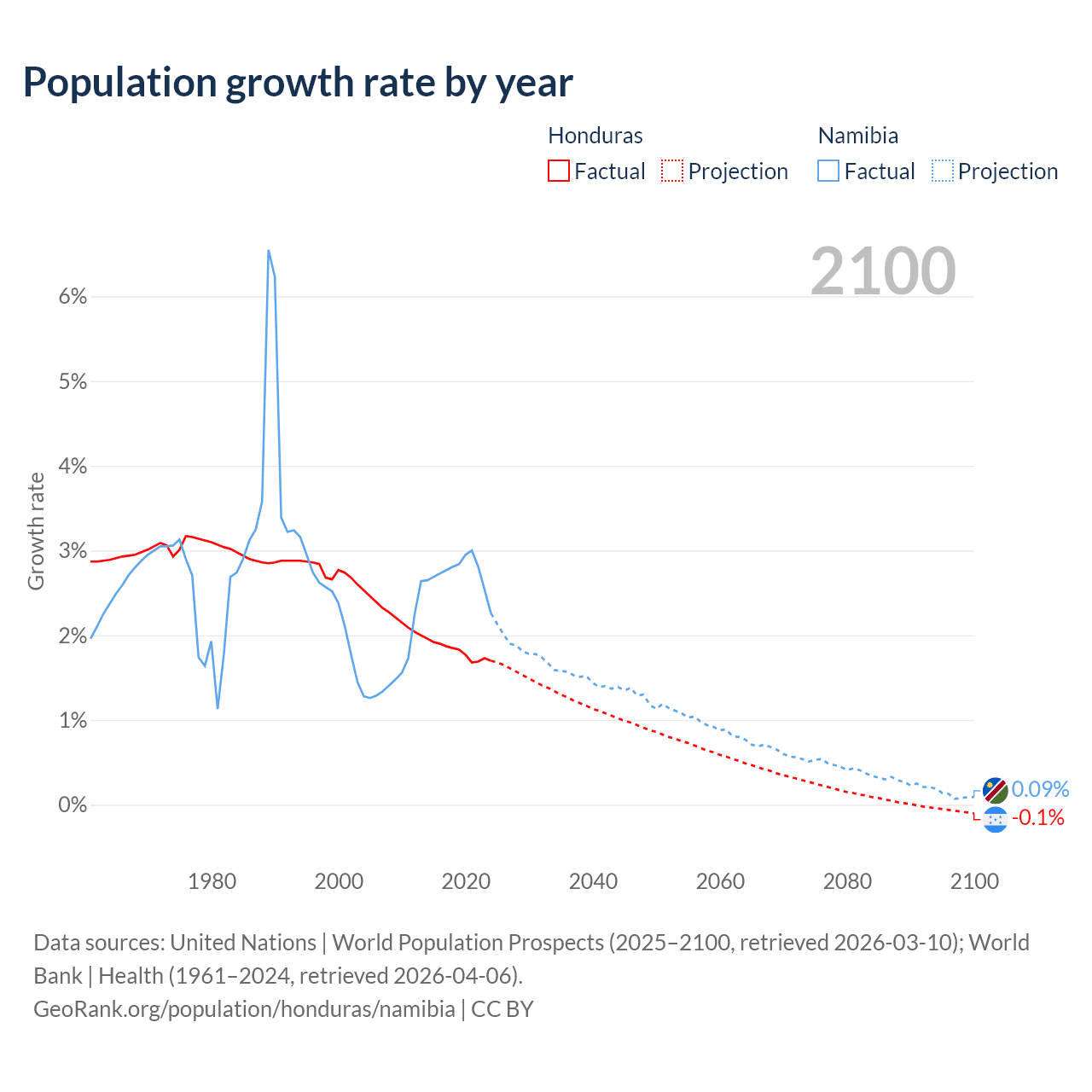 - For the last 10 years, Honduras has had an average growth rate of +1.81% per year vs +2.73% in Namibia.