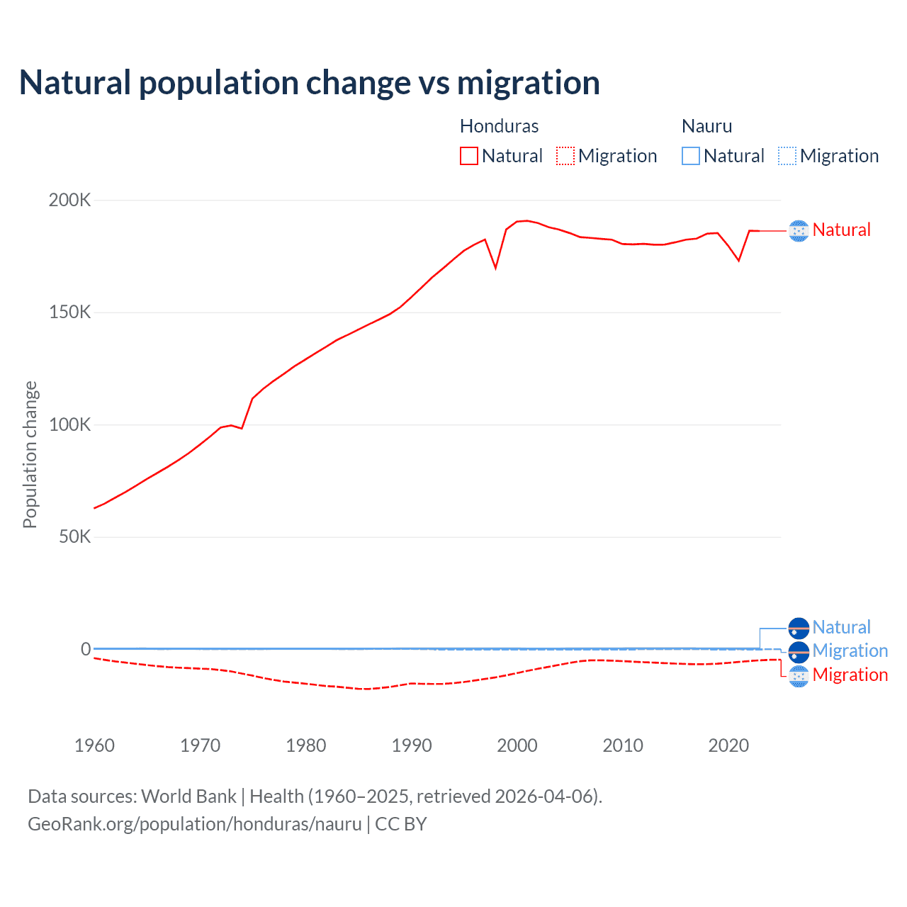 Over the last 10 years, 96.7% of the population change in Honduras is from natural causes (a gain of 1,821,125 people) and 3.29% is from migration (a loss of 61,965 people). In Nauru 66.2% is from natural causes (a gain of 2,590 people) and 33.8% is from migration (a loss of 1,320 people).