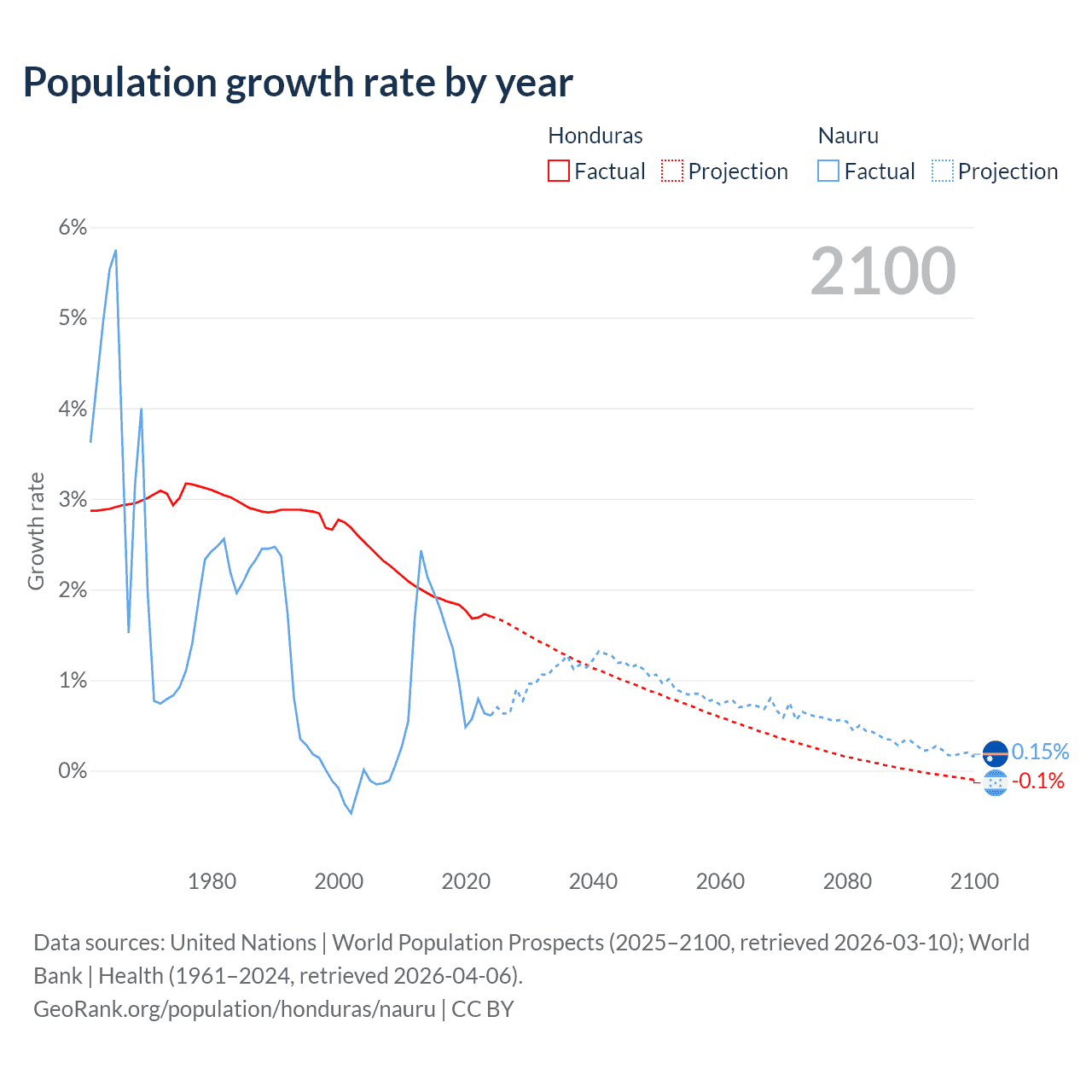 - For the last 10 years, Honduras has had an average growth rate of +1.81% per year vs +1.17% in Nauru.