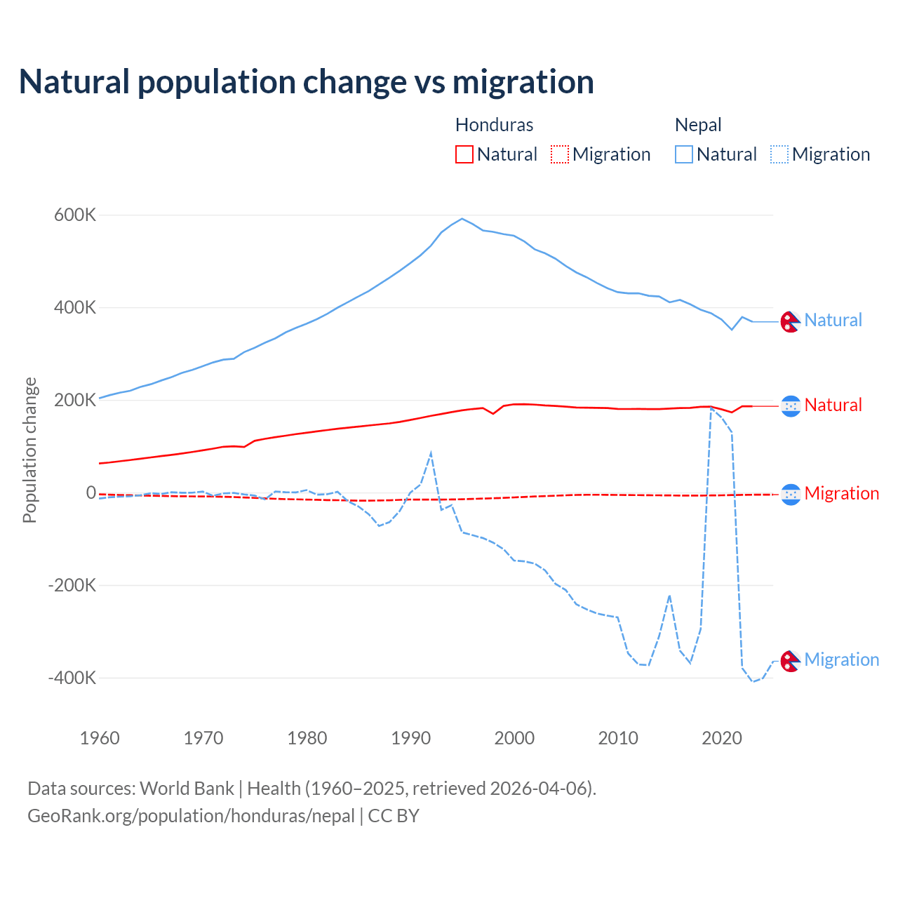 Over the last 10 years, 96.7% of the population change in Honduras is from natural causes (a gain of 1,821,125 people) and 3.29% is from migration (a loss of 61,965 people). In Nepal 67.9% is from natural causes (a gain of 3,909,749 people) and 32.1% is from migration (a loss of 1,851,664 people).