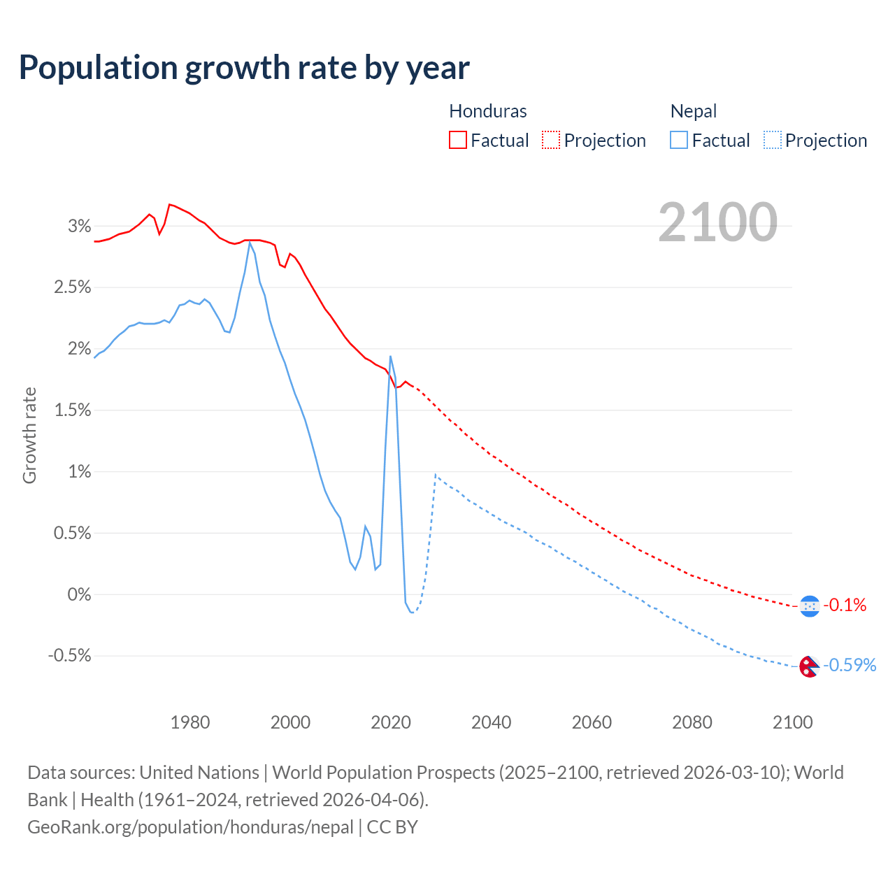 Data sources: World Bank | Health (1960–2024, retrieved 2026-04-06); United Nations | World Population Prospects (1960–2026, retrieved 2026-03-10); U.S. Census Bureau (1960–2025, retrieved 2026-02-08); Central Intelligence Agency (CIA) (2000–2019, retrieved 2026-02-20).