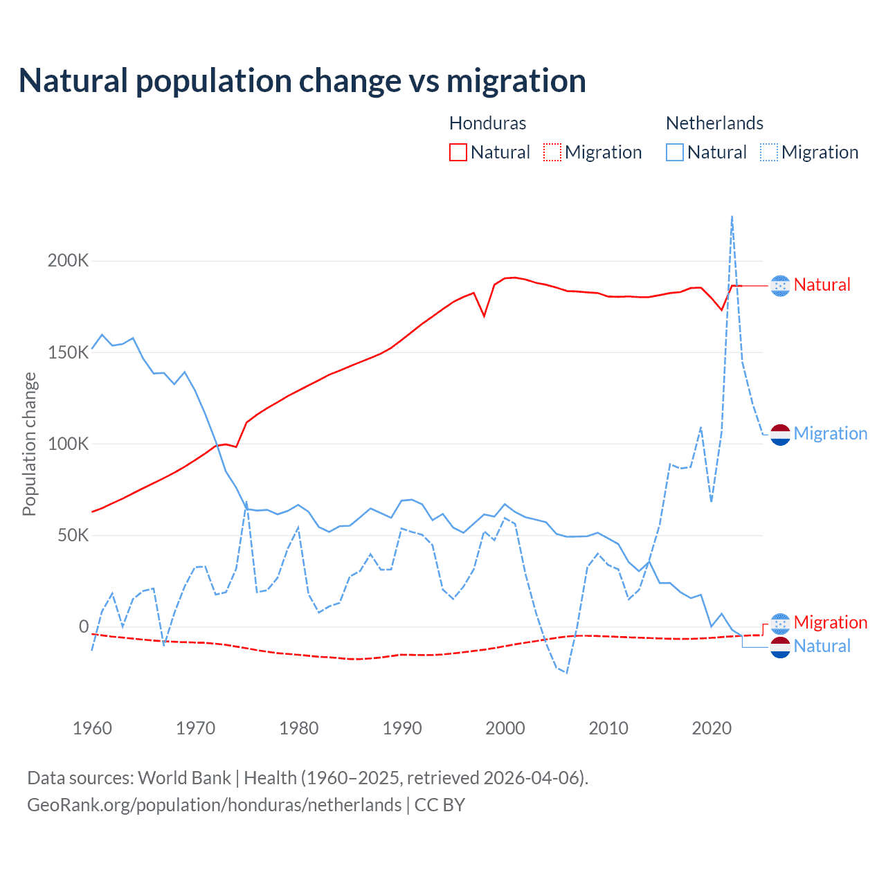 Over the last 10 years, 96.7% of the population change in Honduras is from natural causes (a gain of 1,821,125 people) and 3.29% is from migration (a loss of 61,965 people). In the Netherlands 11.8% is from natural causes (a gain of 134,554 people) and 88.2% is from migration (a gain of 1,006,495 people).