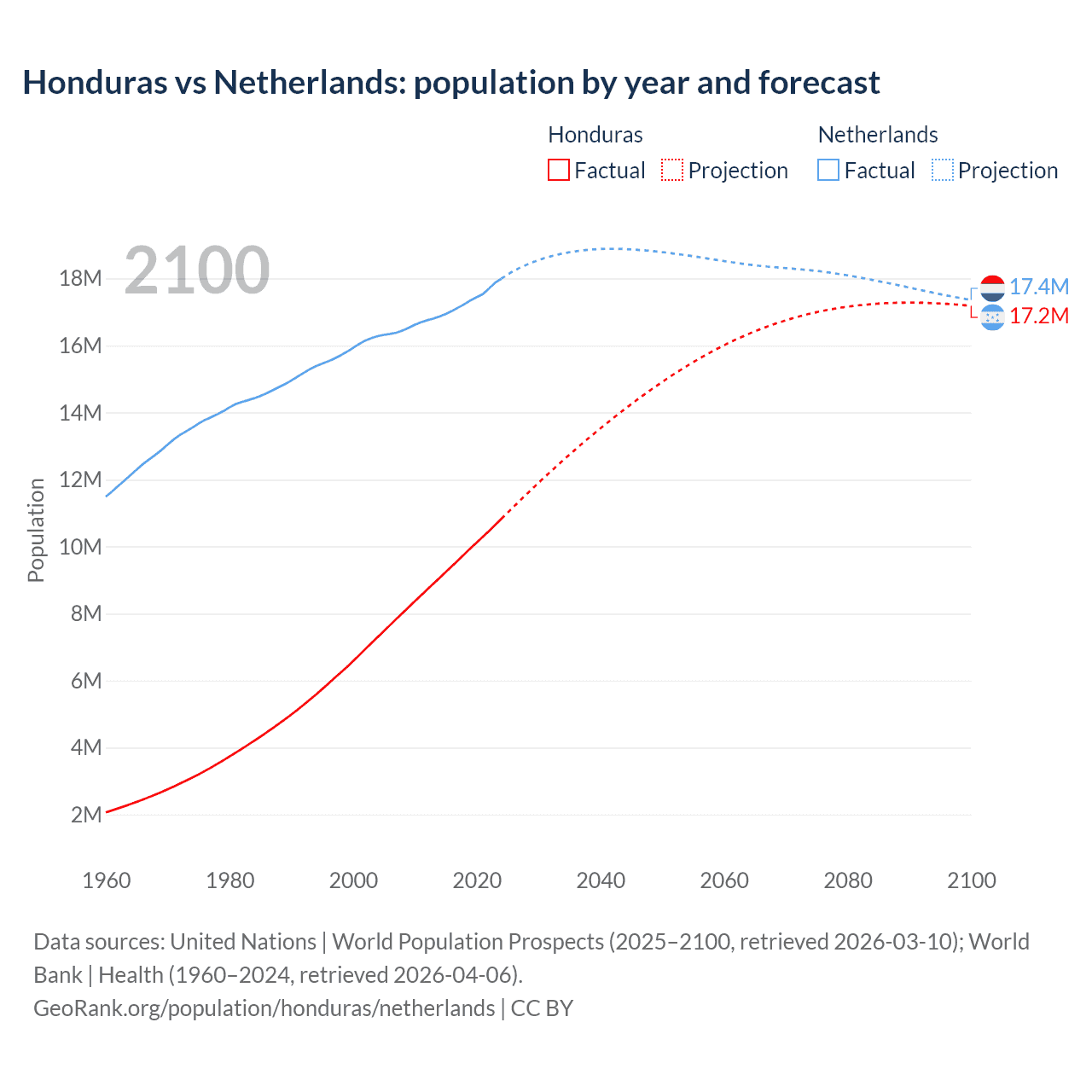 Honduras vs Netherlands: population by year and forecast