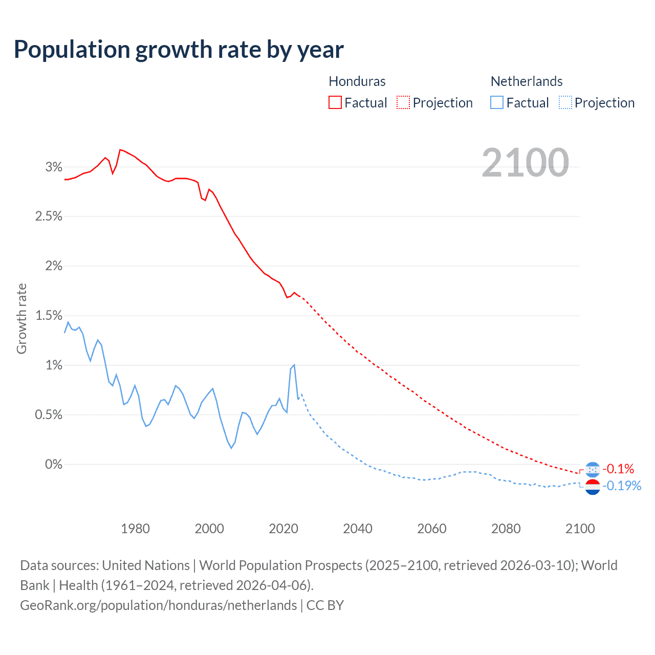 - For the last 10 years, Honduras has had an average growth rate of +1.81% per year vs +0.62% in the Netherlands.