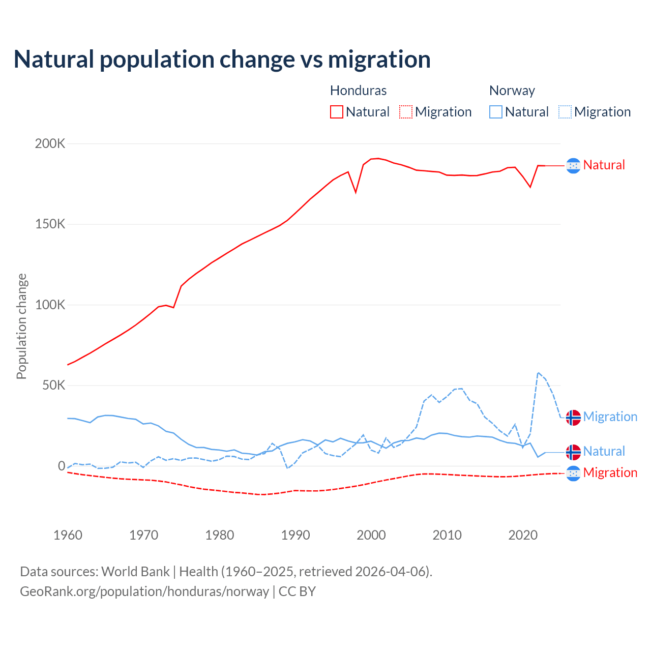 Over the last 10 years, 96.7% of the population change in Honduras is from natural causes (a gain of 1,821,125 people) and 3.29% is from migration (a loss of 61,965 people). In Norway 31.3% is from natural causes (a gain of 138,699 people) and 68.7% is from migration (a gain of 303,945 people).