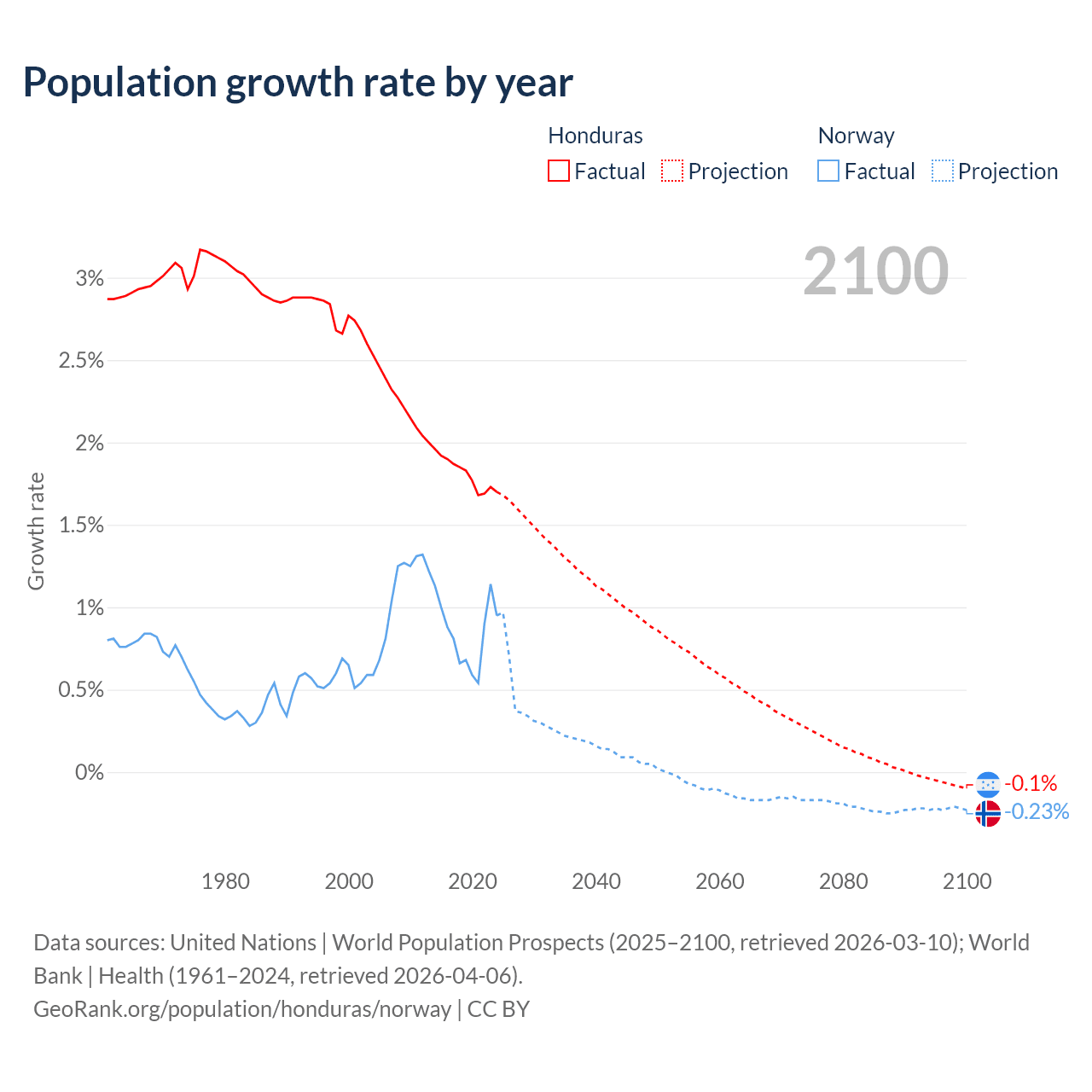- For the last 10 years, Honduras has had an average growth rate of +1.81% per year vs +0.85% in Norway.