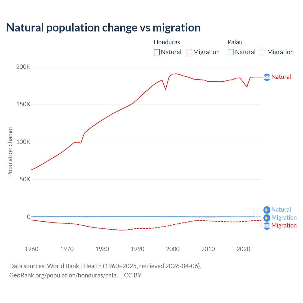 Over the last 10 years, 96.7% of the population change in Honduras is from natural causes (a gain of 1,821,125 people) and 3.29% is from migration (a loss of 61,965 people). In Palau 53.8% is from natural causes (a gain of 264 people) and 46.2% is from migration (a loss of 227 people).
