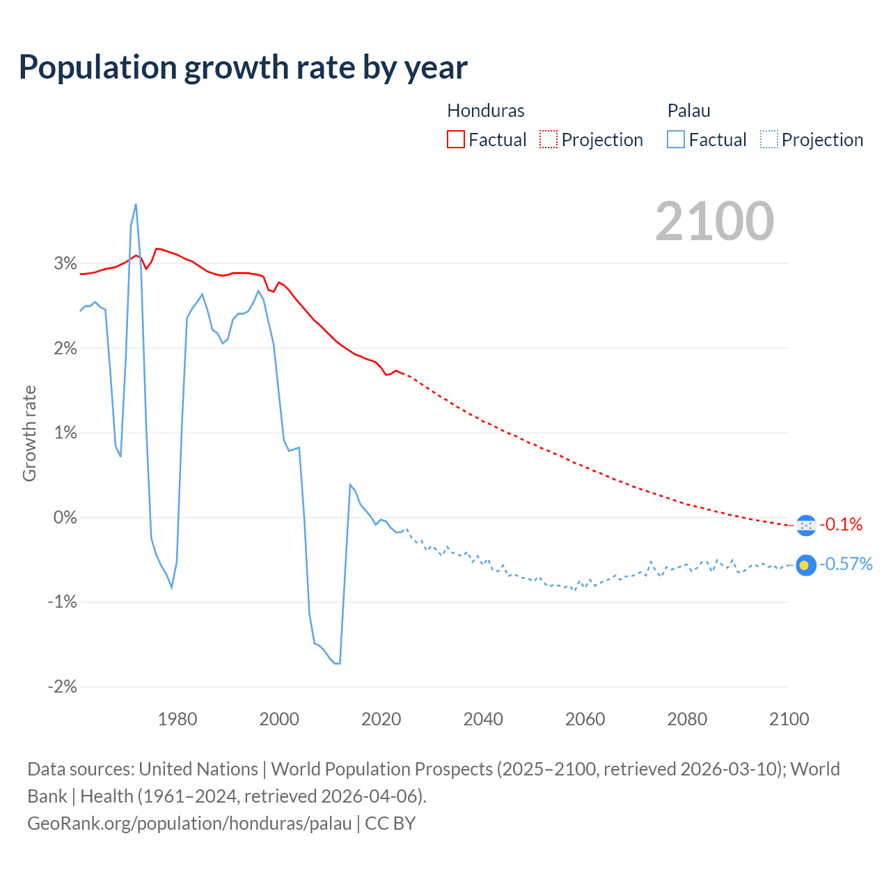- For the last 10 years, Honduras has had an average growth rate of +1.81% per year vs +0.02% in Palau.