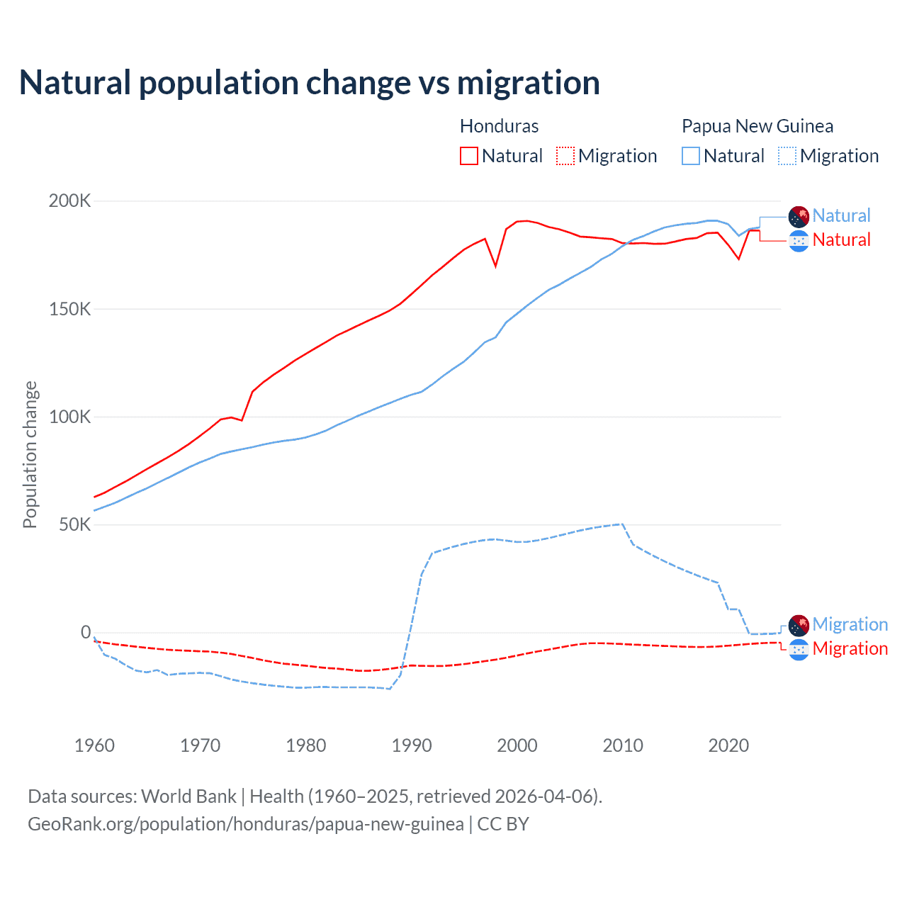 Over the last 10 years, 96.7% of the population change in Honduras is from natural causes (a gain of 1,821,125 people) and 3.29% is from migration (a loss of 61,965 people). In Papua New Guinea 91% is from natural causes (a gain of 1,883,906 people) and 8.98% is from migration (a gain of 185,900 people).