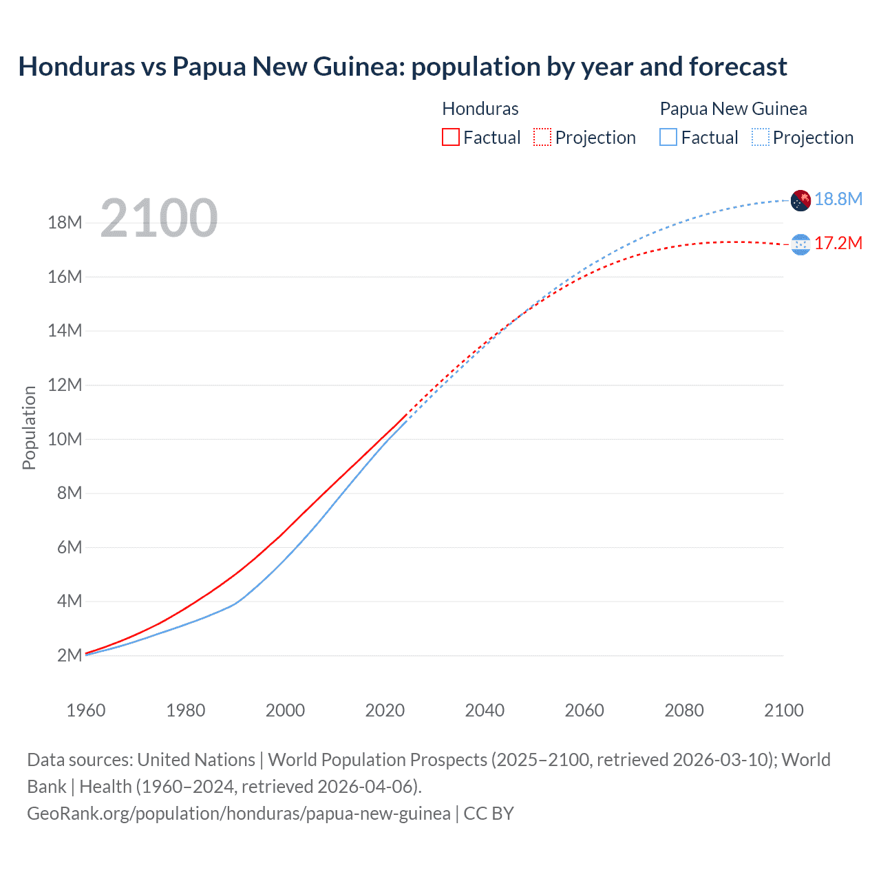 Honduras vs Papua New Guinea: population by year and forecast