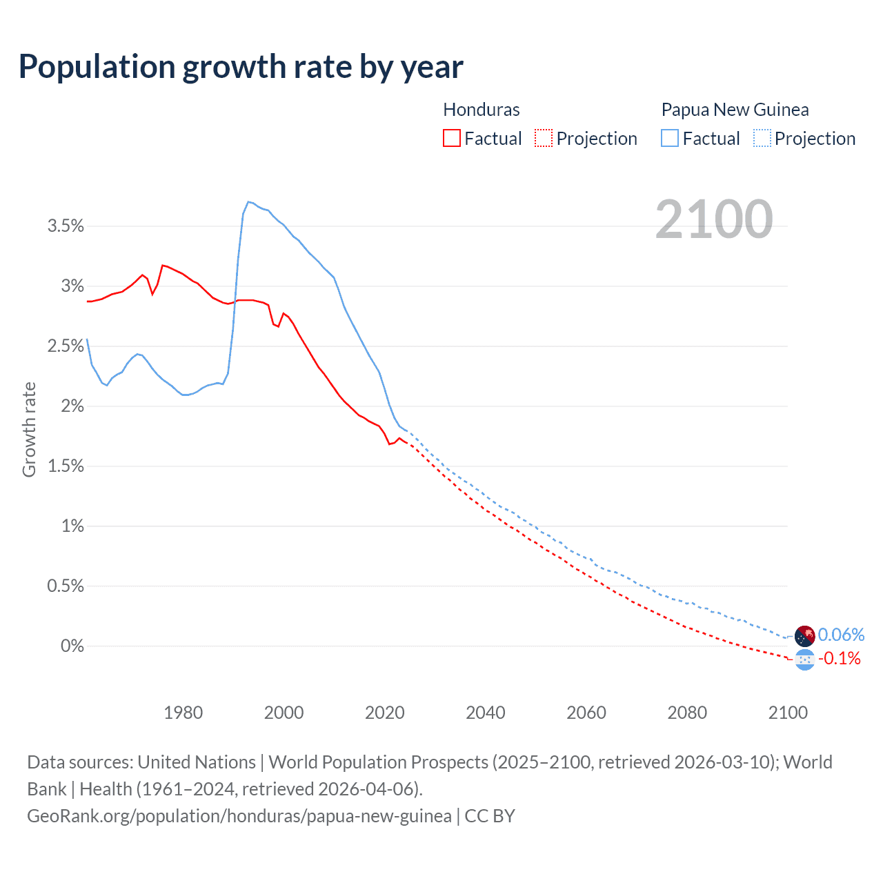- For the last 10 years, Honduras has had an average growth rate of +1.81% per year vs +2.23% in Papua New Guinea.