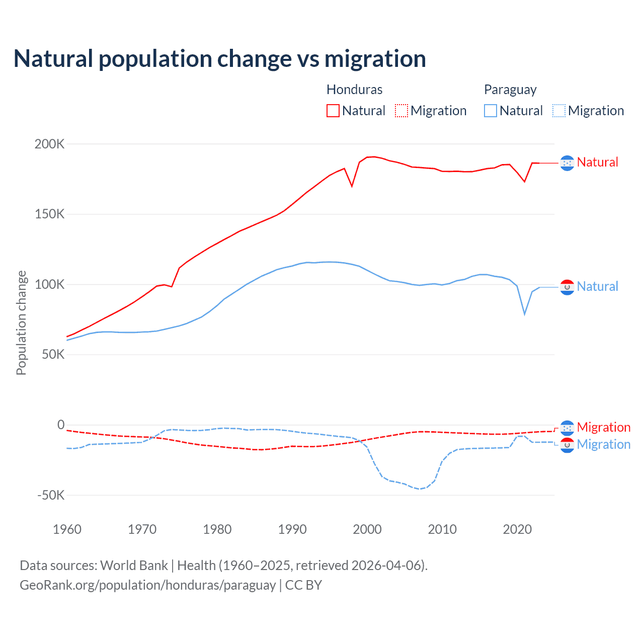 Over the last 10 years, 96.7% of the population change in Honduras is from natural causes (a gain of 1,821,125 people) and 3.29% is from migration (a loss of 61,965 people). In Paraguay 87.6% is from natural causes (a gain of 1,002,636 people) and 12.4% is from migration (a loss of 141,377 people).