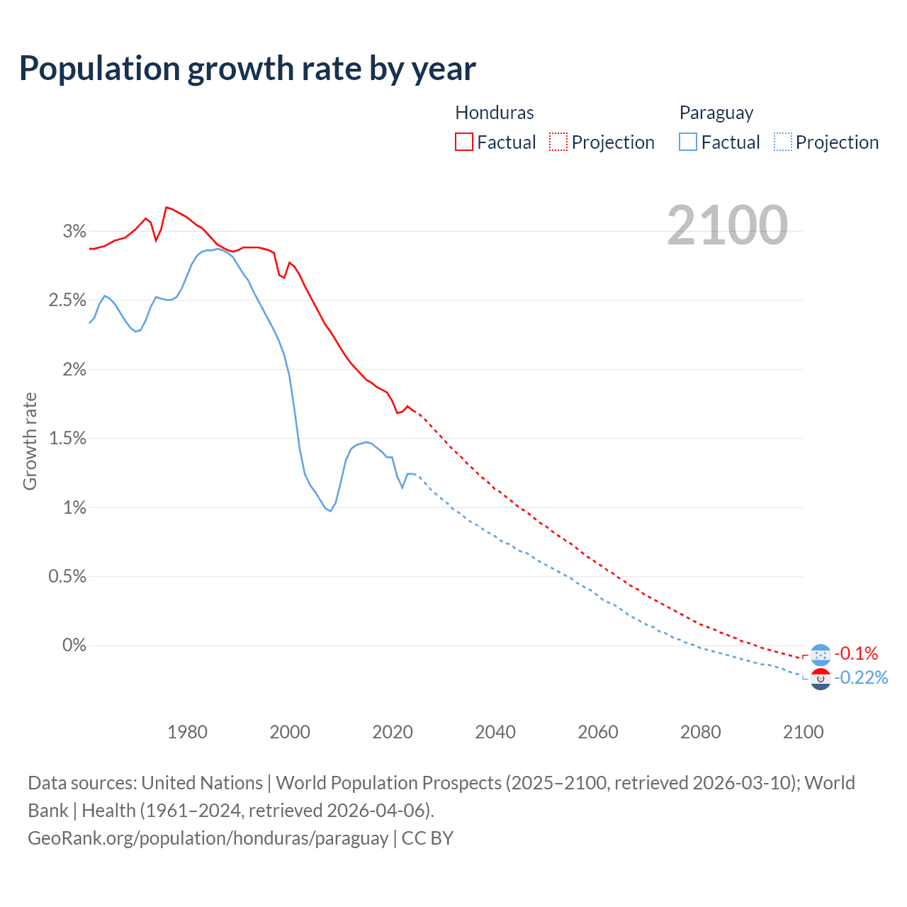 - For the last 10 years, Honduras has had an average growth rate of +1.81% per year vs +1.34% in Paraguay.