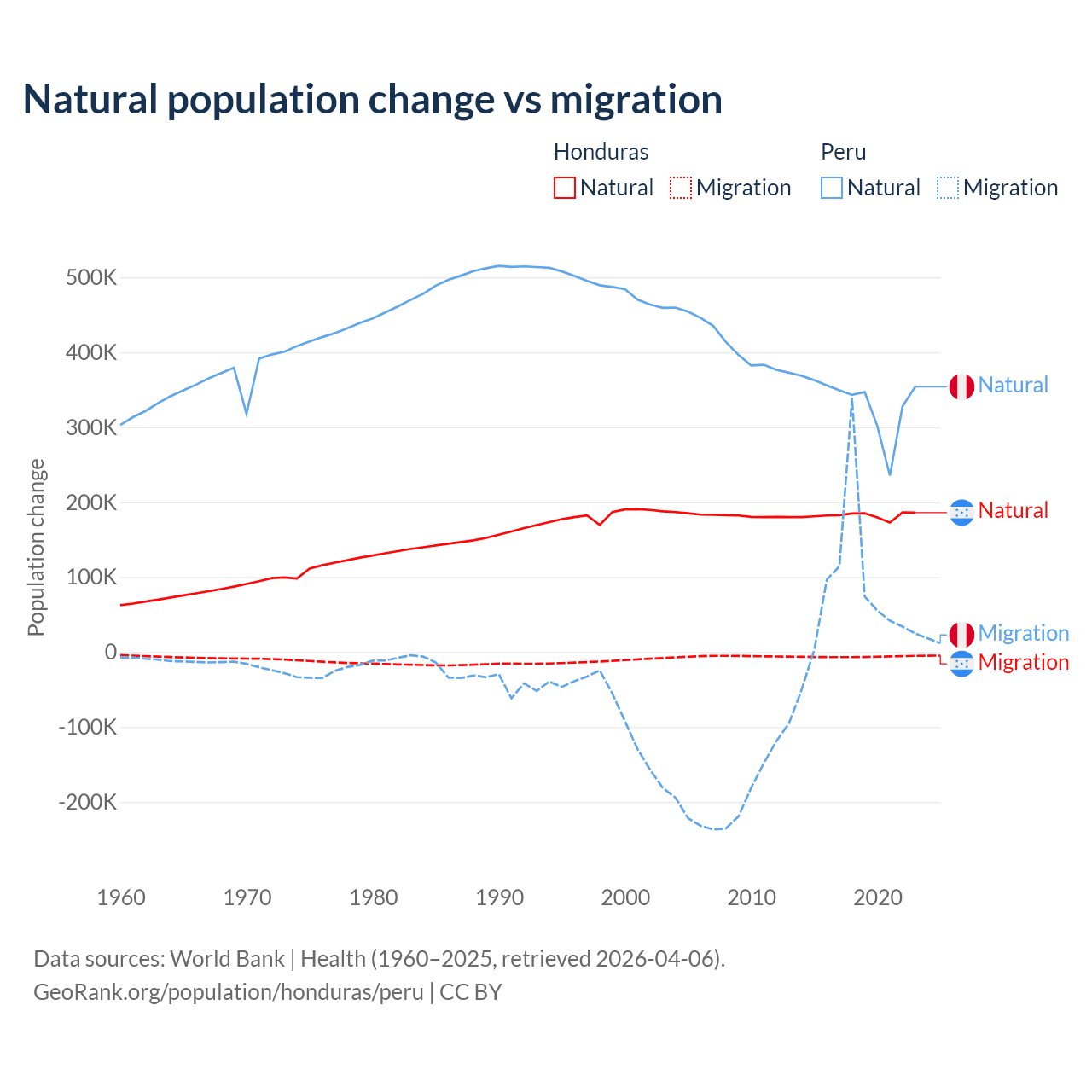 Over the last 10 years, 96.7% of the population change in Honduras is from natural causes (a gain of 1,821,125 people) and 3.29% is from migration (a loss of 61,965 people). In Peru 82% is from natural causes (a gain of 3,345,822 people) and 18% is from migration (a gain of 732,505 people).