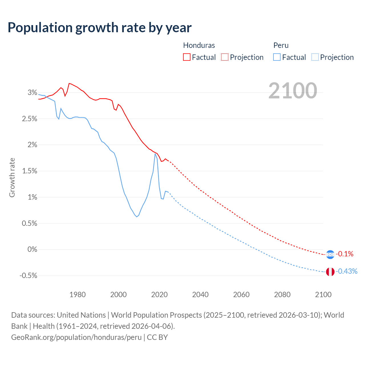 - For the last 10 years, Honduras has had an average growth rate of +1.81% per year vs +1.26% in Peru.