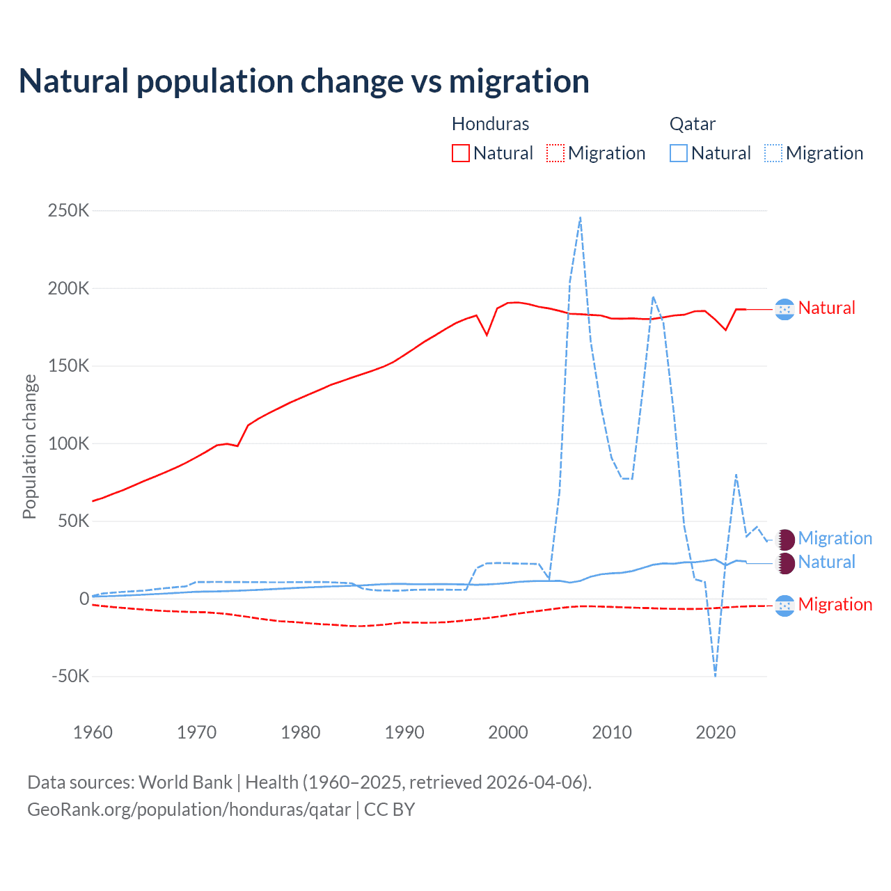 Over the last 10 years, 96.7% of the population change in Honduras is from natural causes (a gain of 1,821,125 people) and 3.29% is from migration (a loss of 61,965 people). In Qatar 26.1% is from natural causes (a gain of 232,009 people) and 73.9% is from migration (a gain of 655,712 people).