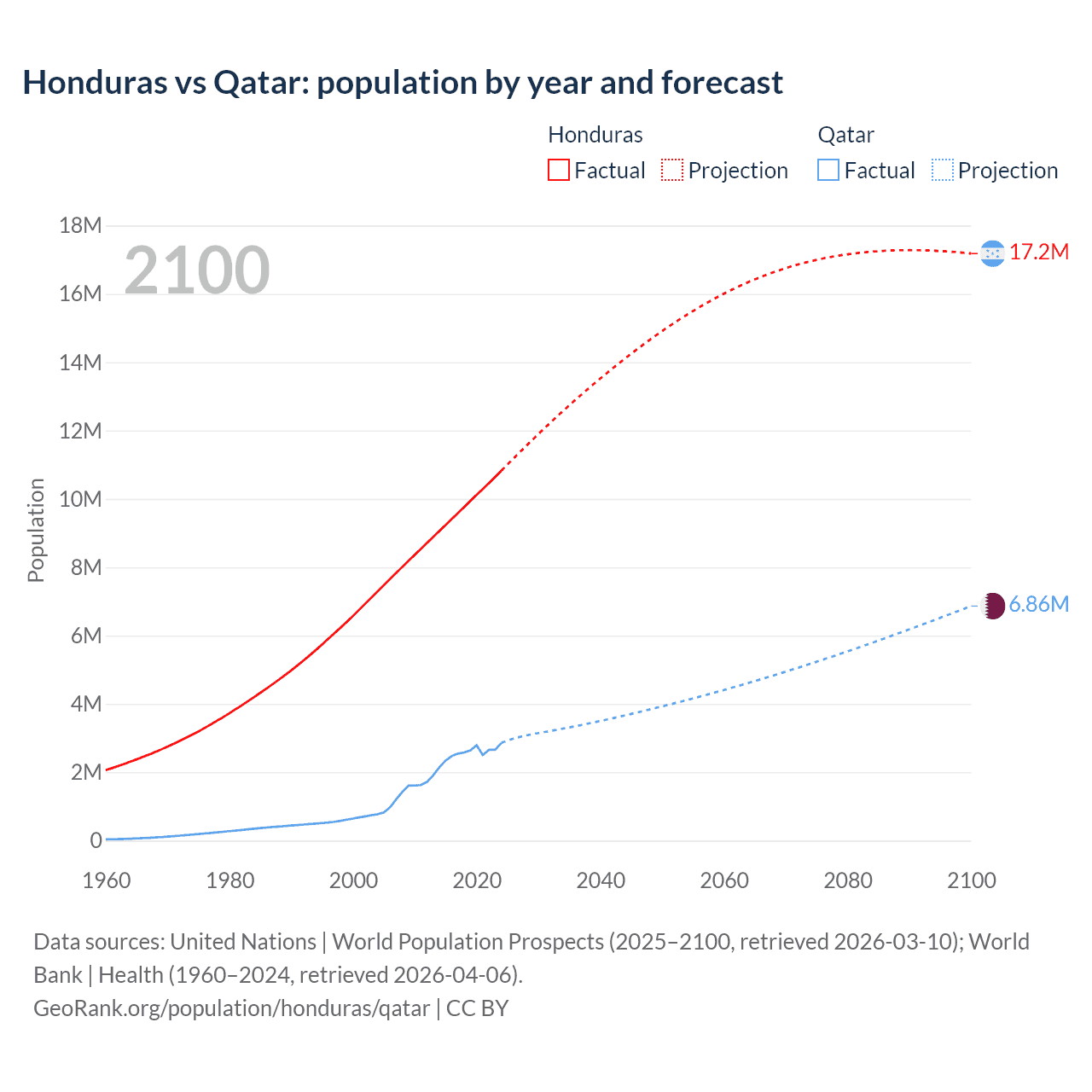 The latest officially reported population of Honduras was 10,825,703 in 2024 vs 2,857,822 people in Qatar in 2024. In 2026, based on the adjusted UN estimation, the current Honduras' population is 11,237,619 people compared to 2,999,260 in Qatar.