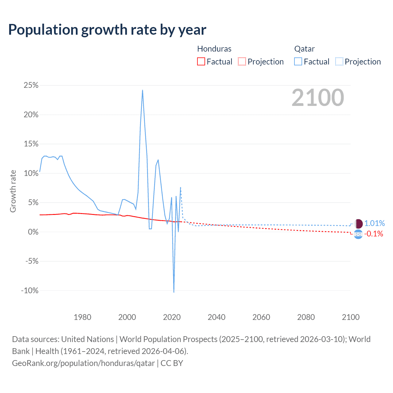 - For the last 10 years, Honduras has had an average growth rate of +1.81% per year vs +3.86% in Qatar.
