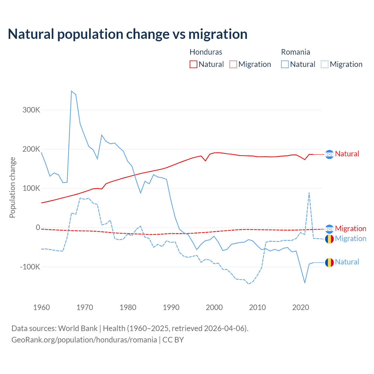 Over the last 10 years, 96.7% of the population change in Honduras is from natural causes (a gain of 1,821,125 people) and 3.29% is from migration (a loss of 61,965 people). In Romania 82% is from natural causes (a loss of 766,295 people) and 18% is from migration (a loss of 167,917 people).