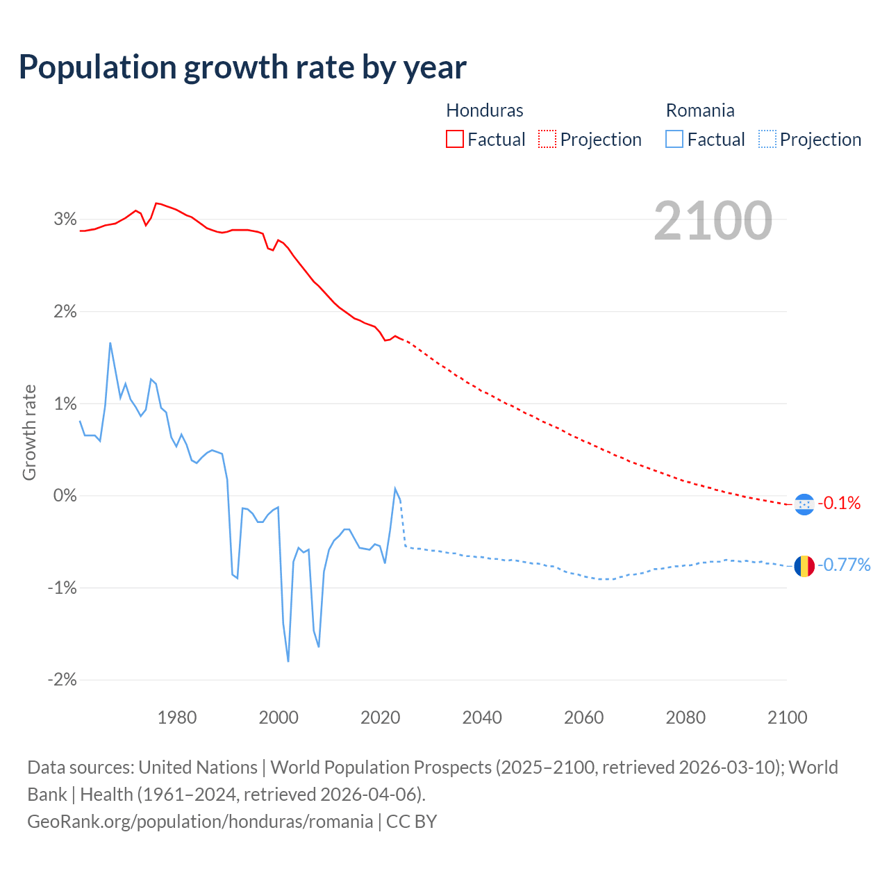- For the last 10 years, Honduras has had an average growth rate of +1.81% per year vs -0.43% in Romania.