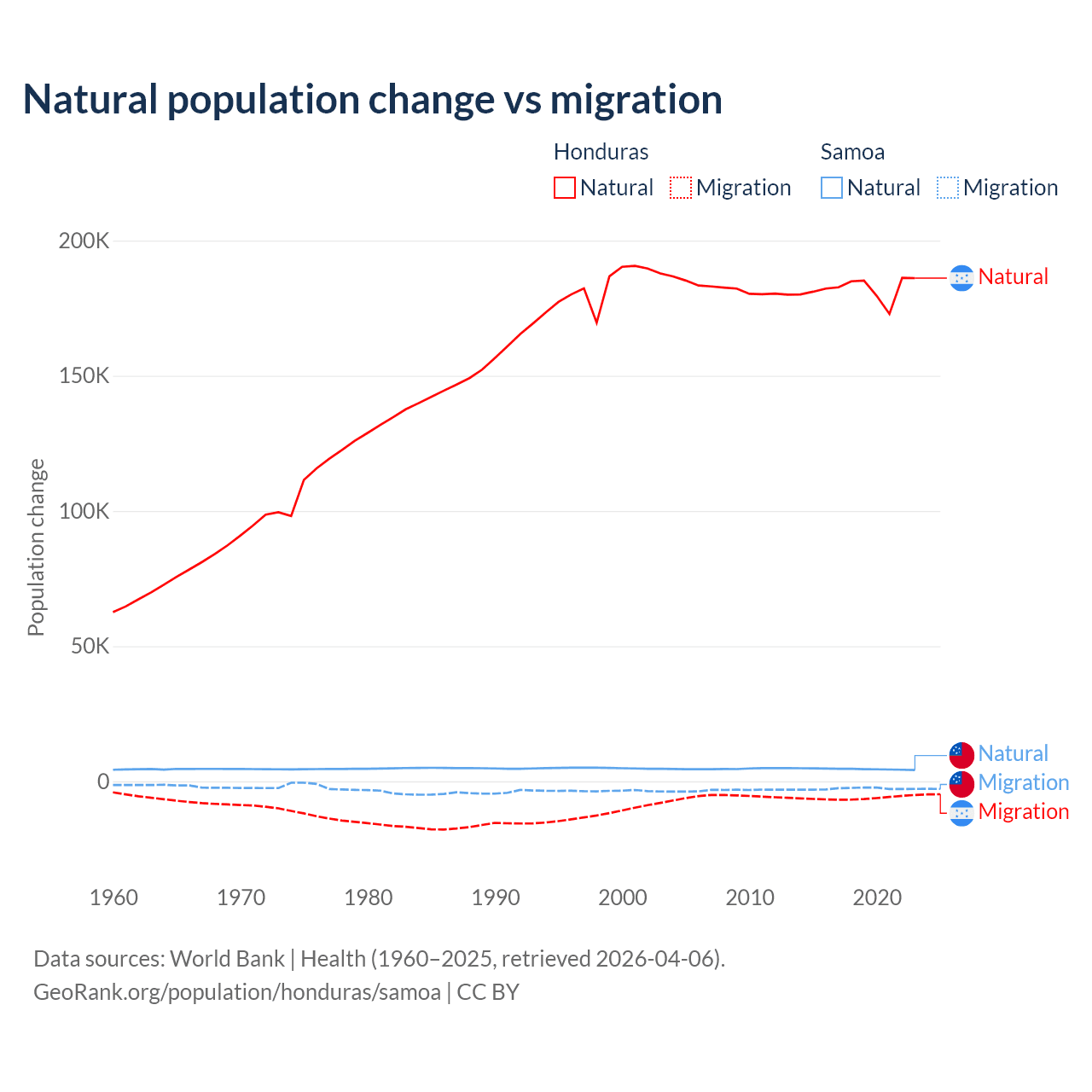 Over the last 10 years, 96.7% of the population change in Honduras is from natural causes (a gain of 1,821,125 people) and 3.29% is from migration (a loss of 61,965 people). In Samoa 62.5% is from natural causes (a gain of 45,436 people) and 37.5% is from migration (a loss of 27,246 people).