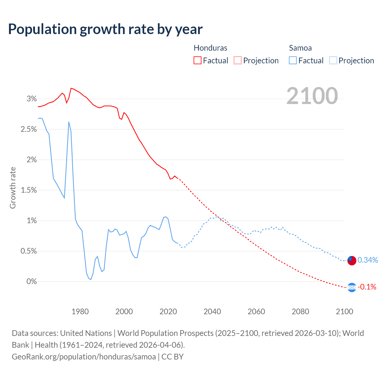 - For the last 10 years, Honduras has had an average growth rate of +1.81% per year vs +0.87% in Samoa.