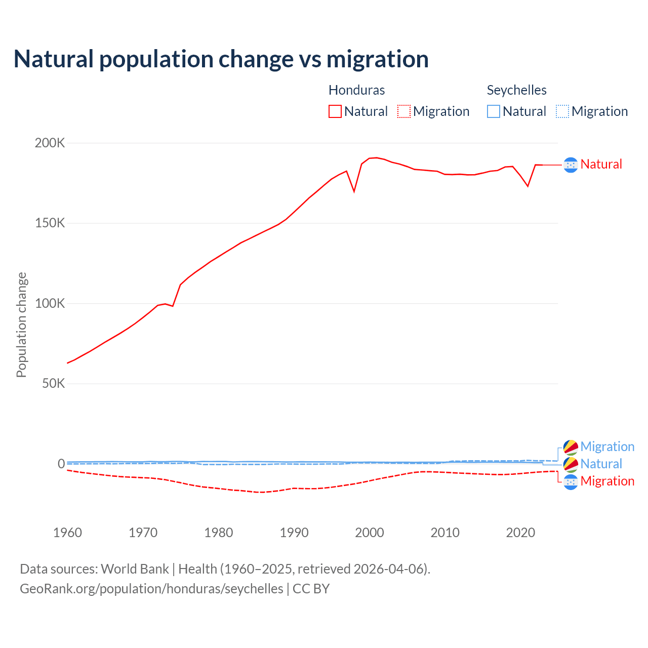 Over the last 10 years, 96.7% of the population change in Honduras is from natural causes (a gain of 1,821,125 people) and 3.29% is from migration (a loss of 61,965 people). In the Seychelles 31.4% is from natural causes (a gain of 8,122 people) and 68.6% is from migration (a gain of 17,748 people).
