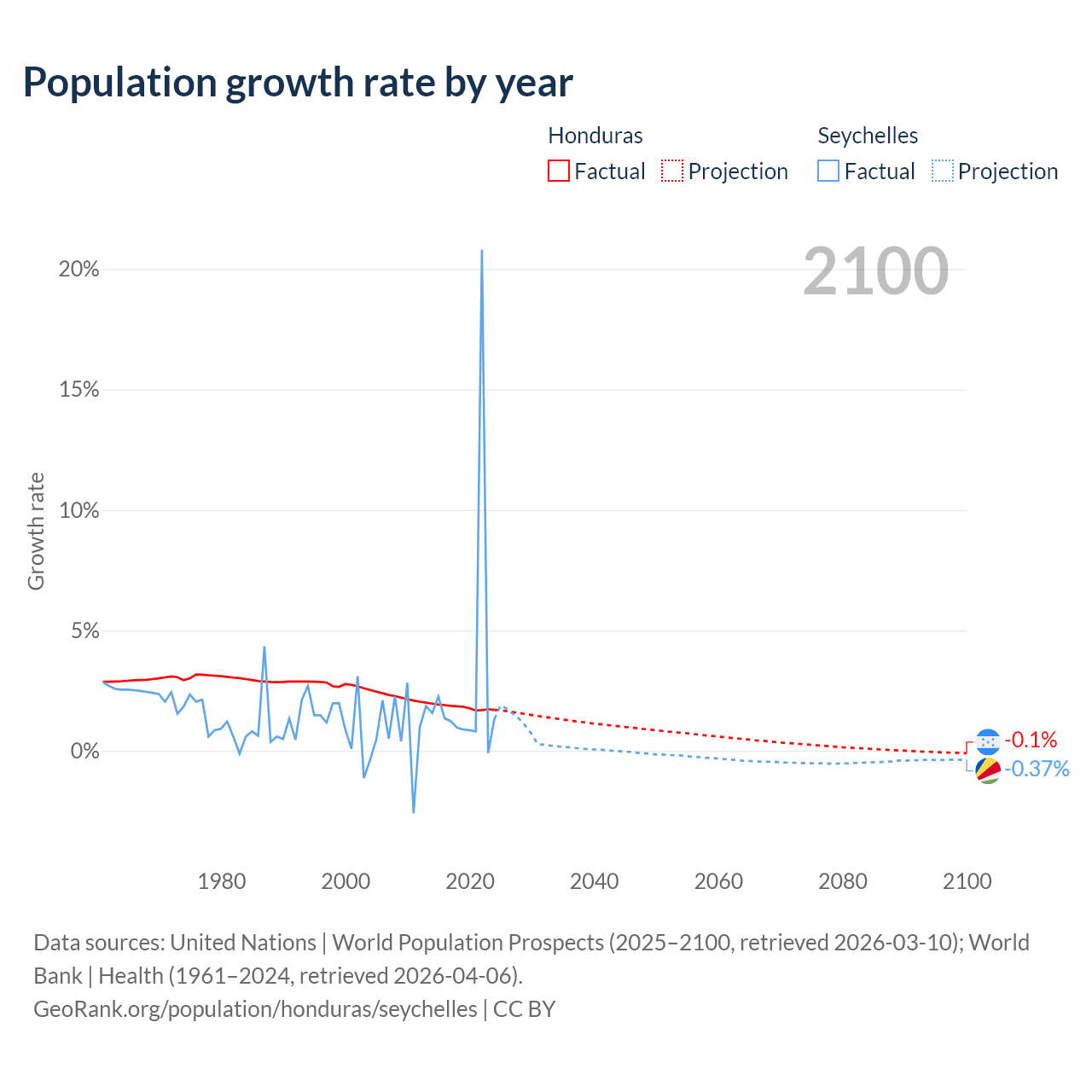 - For the last 10 years, Honduras has had an average growth rate of +1.81% per year vs +2.9% in the Seychelles.