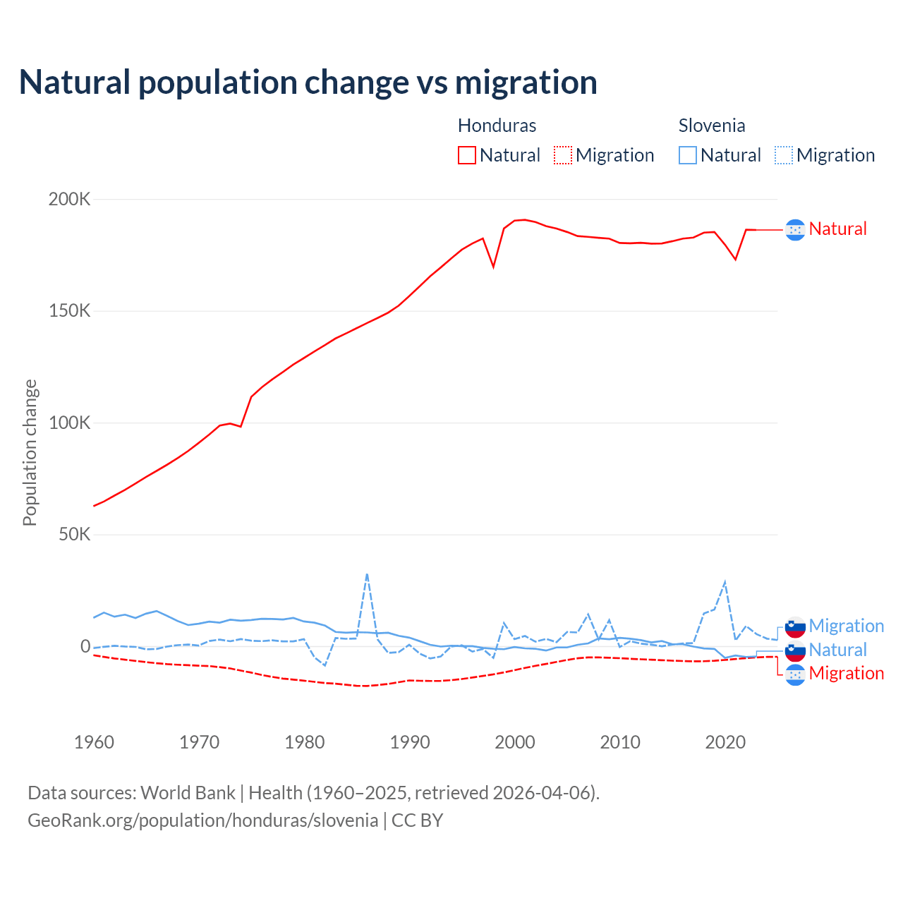 Over the last 10 years, 96.7% of the population change in Honduras is from natural causes (a gain of 1,821,125 people) and 3.29% is from migration (a loss of 61,965 people). In Slovenia 18.1% is from natural causes (a loss of 17,573 people) and 81.9% is from migration (a gain of 79,532 people).