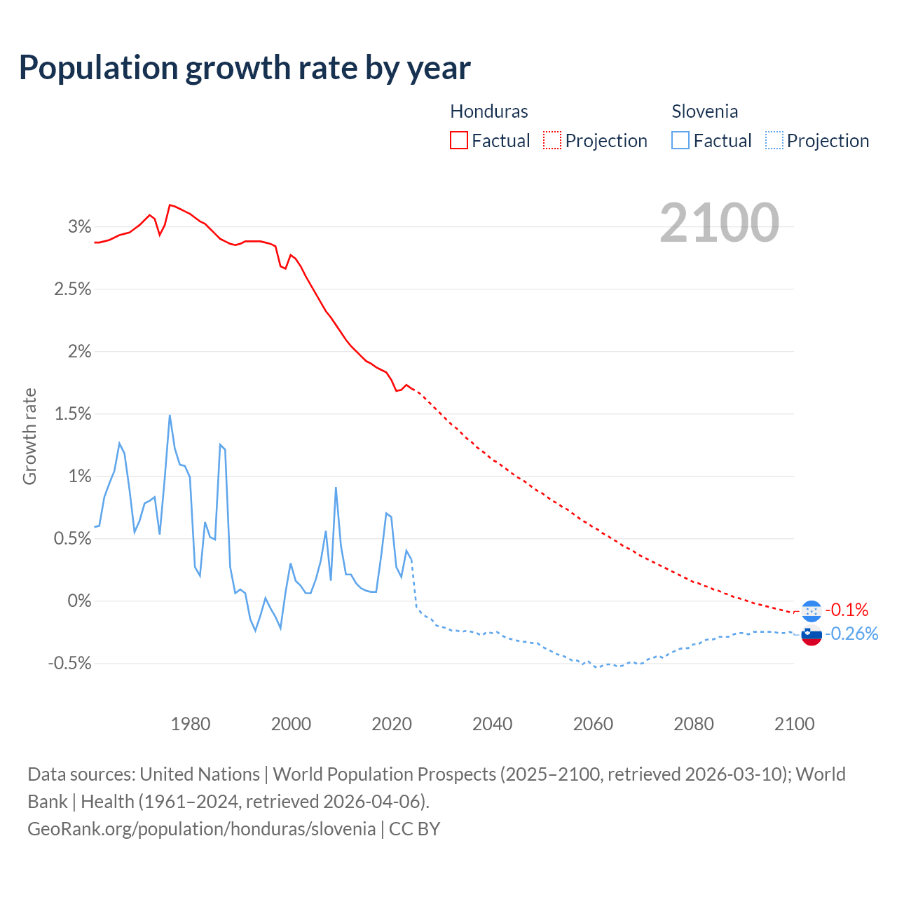 - For the last 10 years, Honduras has had an average growth rate of +1.81% per year vs +0.29% in Slovenia.