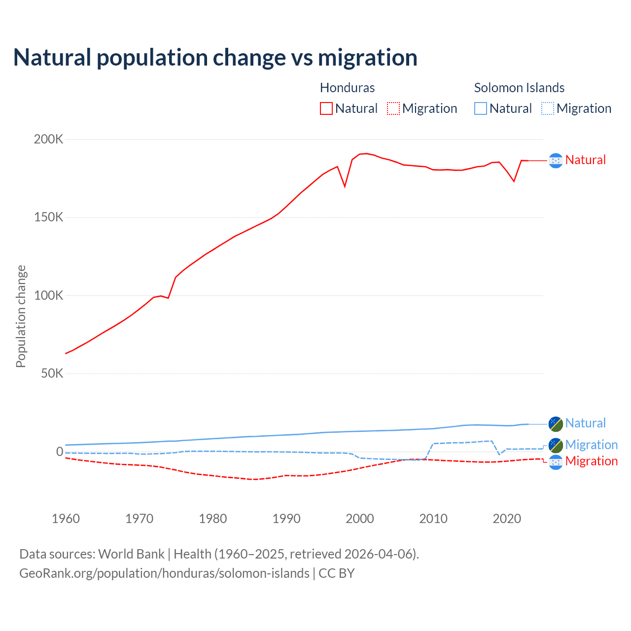 Over the last 10 years, 96.7% of the population change in Honduras is from natural causes (a gain of 1,821,125 people) and 3.29% is from migration (a loss of 61,965 people). In the Solomon Islands 82.8% is from natural causes (a gain of 168,727 people) and 17.2% is from migration (a gain of 35,031 people).