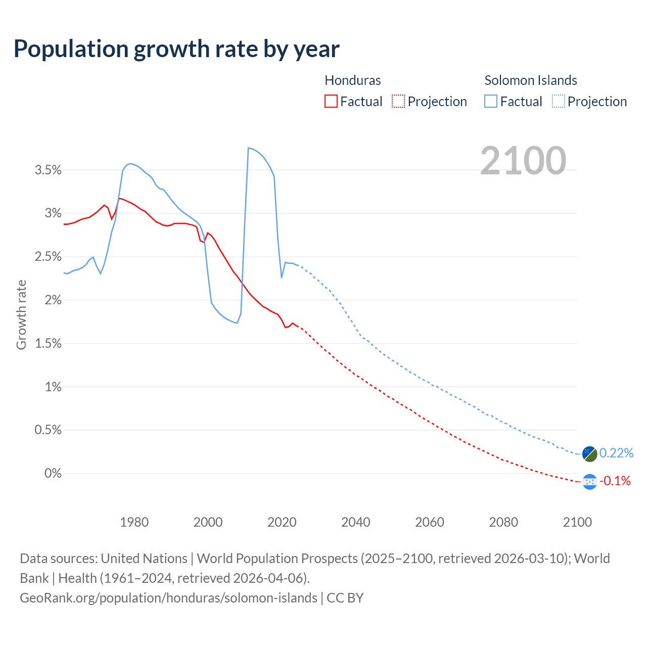 - For the last 10 years, Honduras has had an average growth rate of +1.81% per year vs +2.95% in the Solomon Islands.