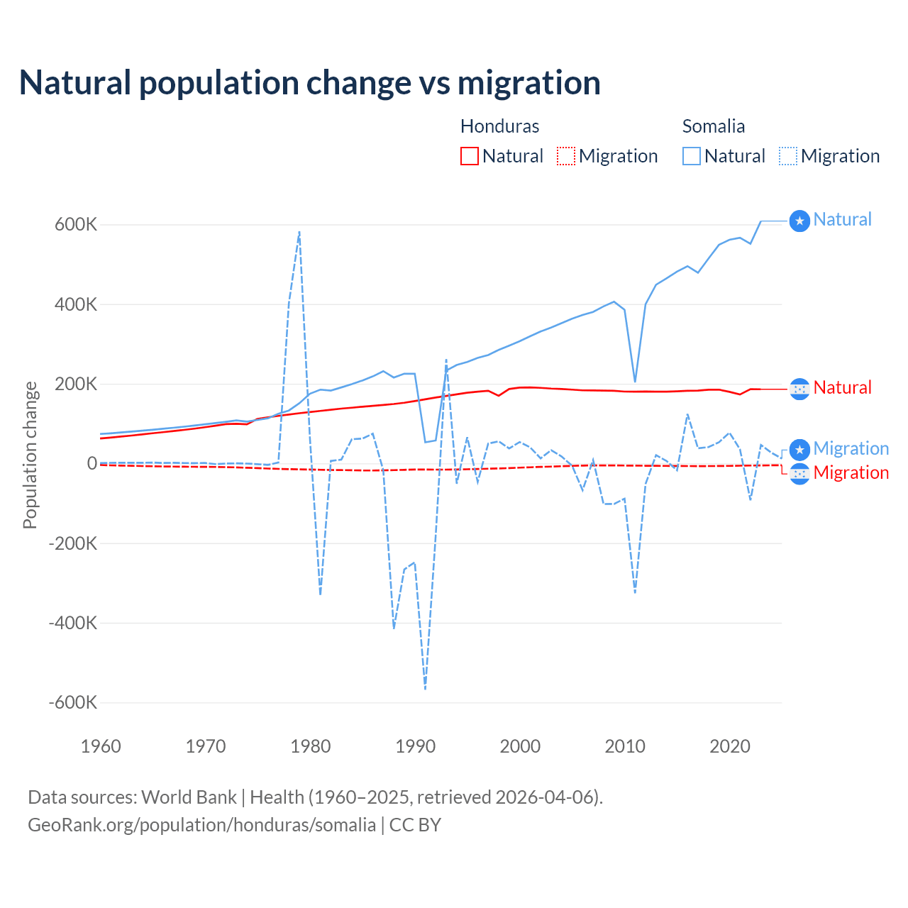 Over the last 10 years, 96.7% of the population change in Honduras is from natural causes (a gain of 1,821,125 people) and 3.29% is from migration (a loss of 61,965 people). In Somalia 94.4% is from natural causes (a gain of 5,270,105 people) and 5.58% is from migration (a gain of 311,487 people).