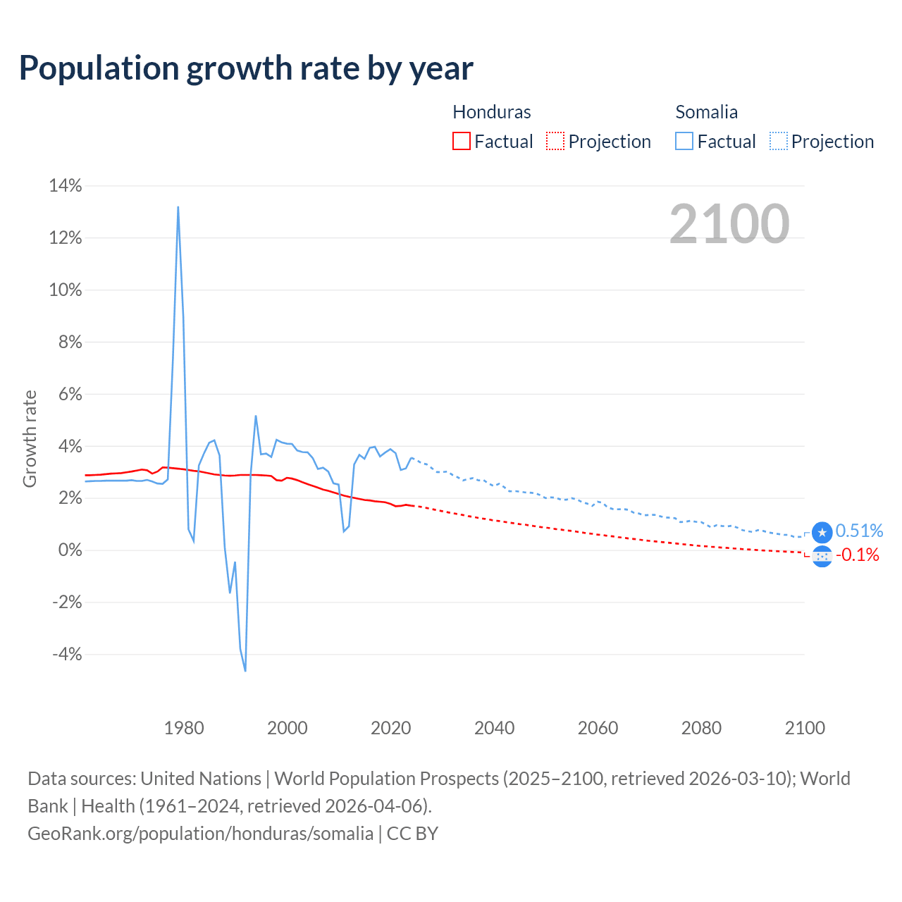 - For the last 10 years, Honduras has had an average growth rate of +1.81% per year vs +3.61% in Somalia.