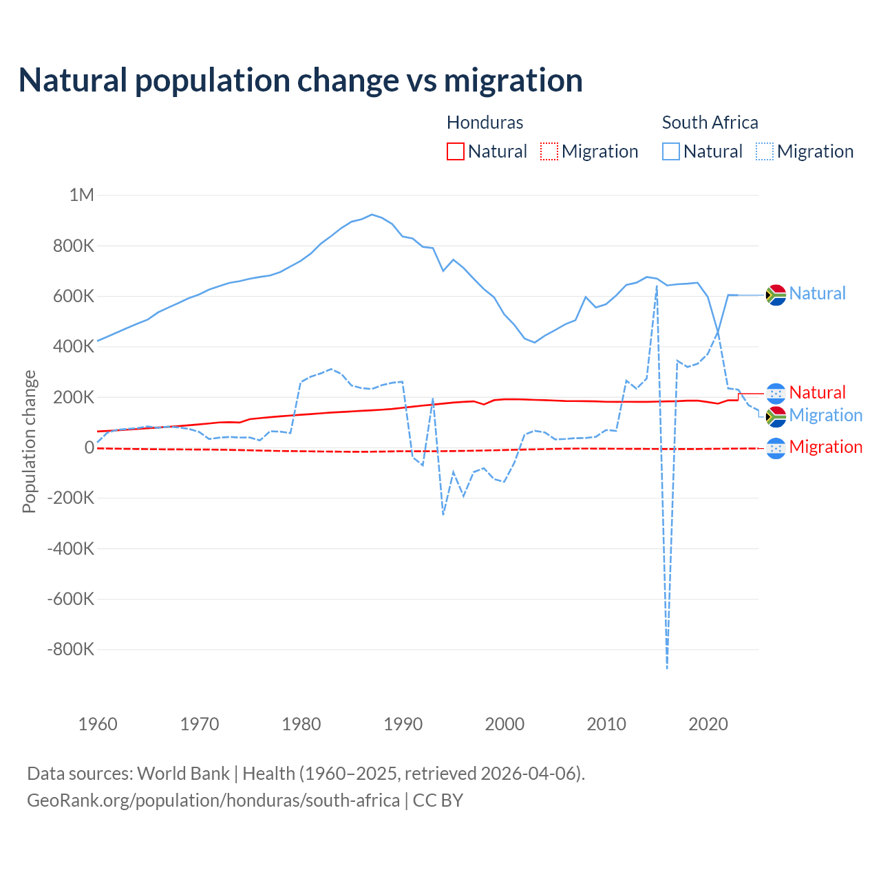 Over the last 10 years, 96.7% of the population change in Honduras is from natural causes (a gain of 1,821,125 people) and 3.29% is from migration (a loss of 61,965 people). In South Africa 72.8% is from natural causes (a gain of 6,190,027 people) and 27.2% is from migration (a gain of 2,316,795 people).