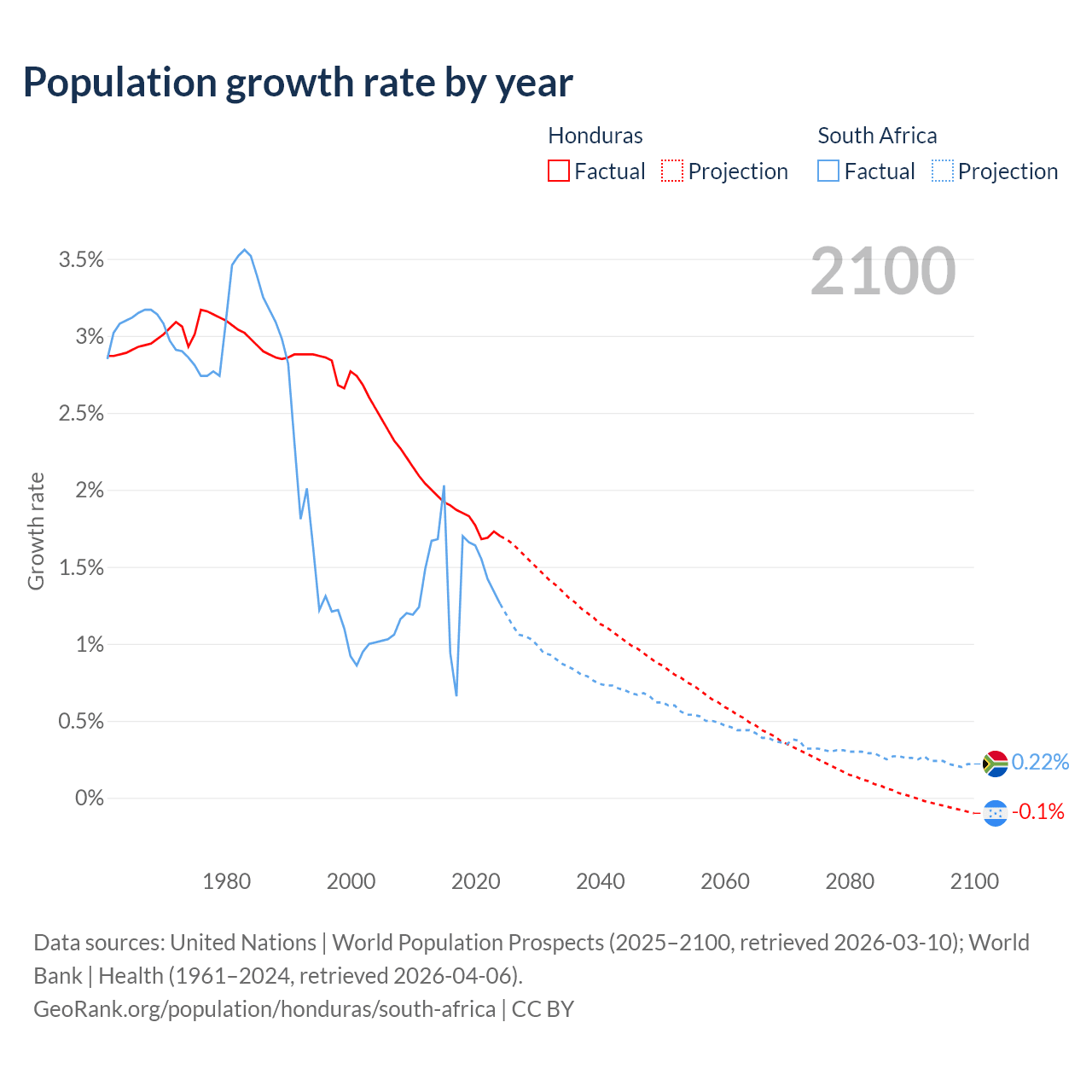 - For the last 10 years, Honduras has had an average growth rate of +1.81% per year vs +1.44% in South Africa.