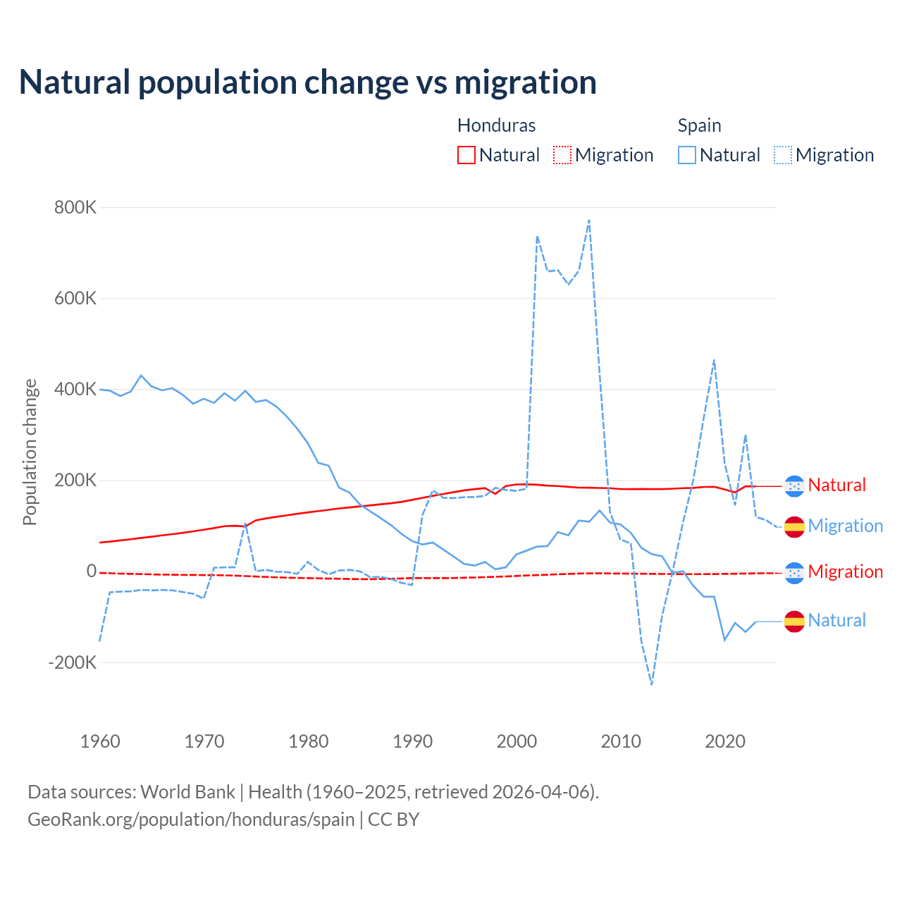 Over the last 10 years, 96.7% of the population change in Honduras is from natural causes (a gain of 1,821,125 people) and 3.29% is from migration (a loss of 61,965 people). In Spain 25.8% is from natural causes (a loss of 627,829 people) and 74.2% is from migration (a gain of 1,810,127 people).