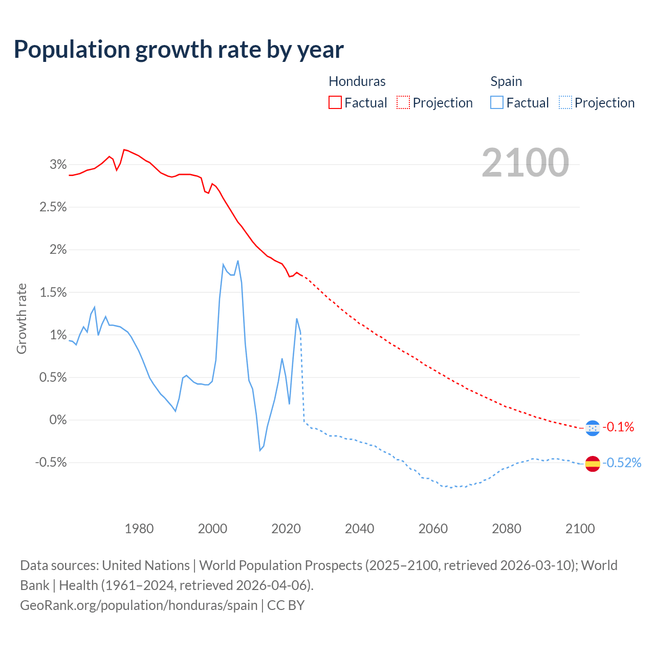 - For the last 10 years, Honduras has had an average growth rate of +1.81% per year vs +0.43% in Spain.