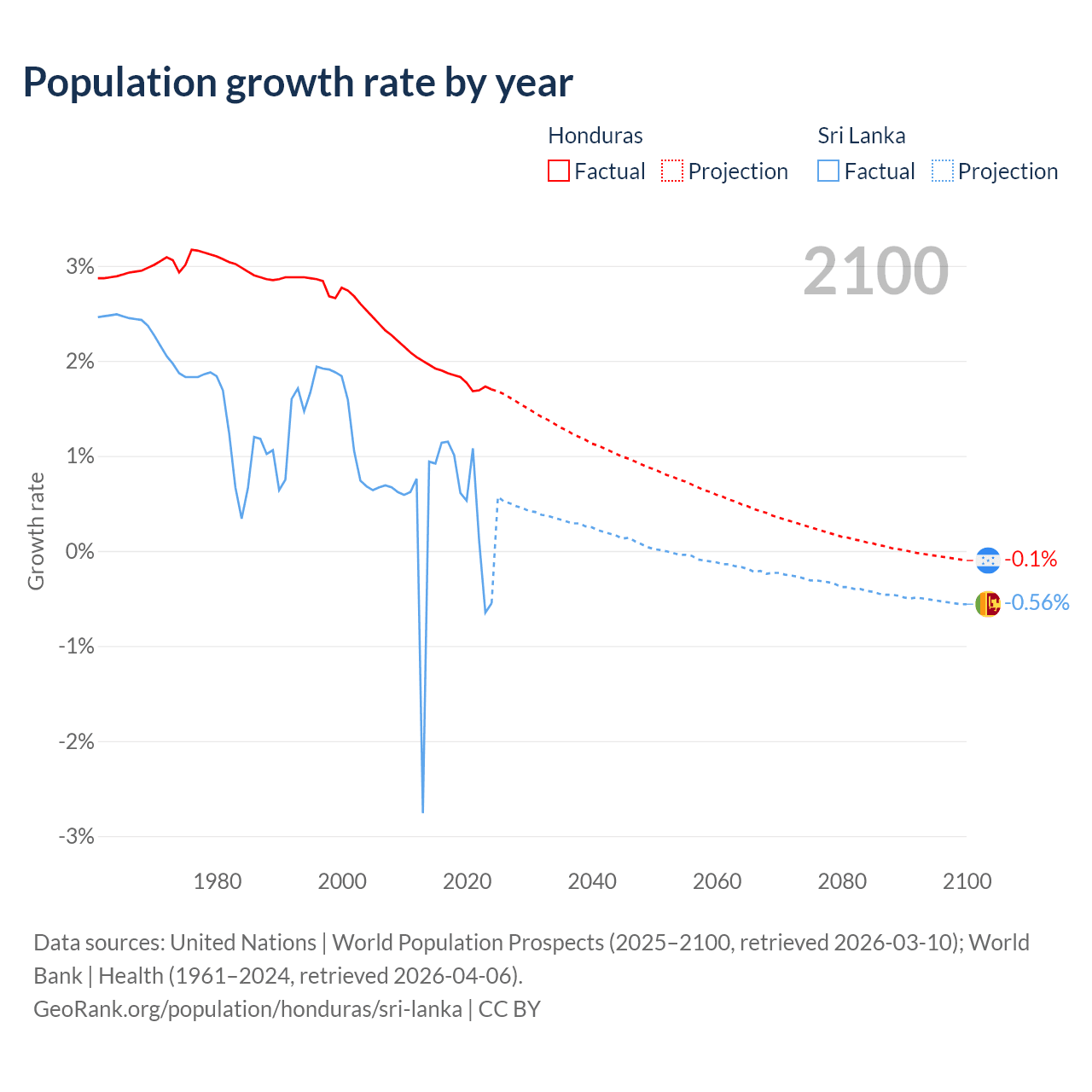 - For the last 10 years, Honduras has had an average growth rate of +1.81% per year vs +0.57% in Sri Lanka.