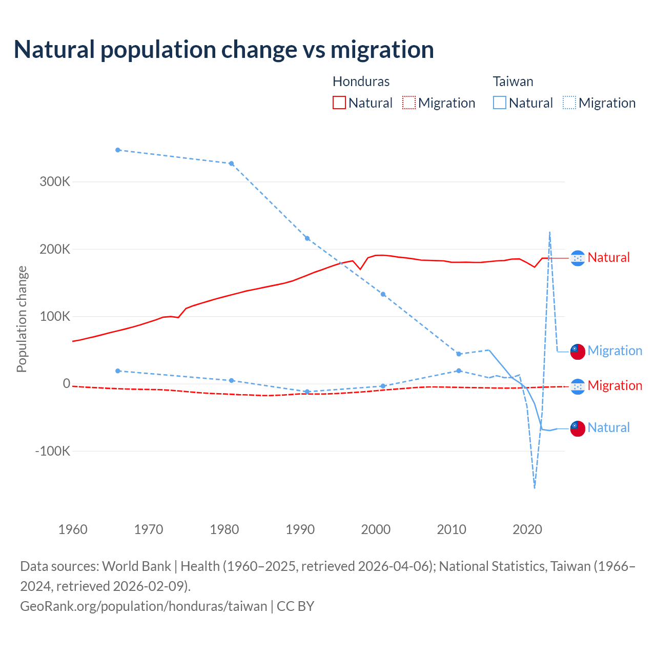 Over the last 10 years, 96.7% of the population change in Honduras is from natural causes (a gain of 1,821,125 people) and 3.29% is from migration (a loss of 61,965 people). In Taiwan 56.7% is from natural causes (a loss of 57,467 people) and 43.3% is from migration (a gain of 43,884 people).