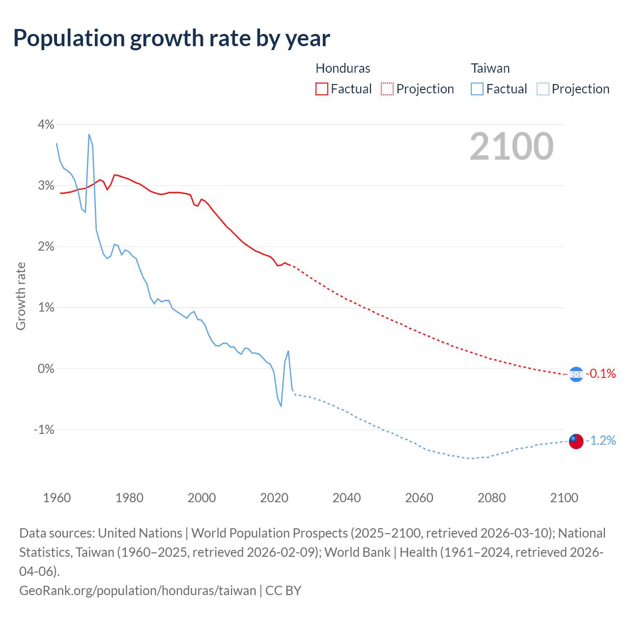 Data sources: World Bank | Health (1960–2024, retrieved 2026-04-06); United Nations | World Population Prospects (1960–2026, retrieved 2026-03-10); U.S. Census Bureau (1960–2025, retrieved 2026-02-08); National Statistics, Taiwan (1960–2025, retrieved 2026-02-09); Central Intelligence Agency (CIA) (2000–2019, retrieved 2026-02-20).