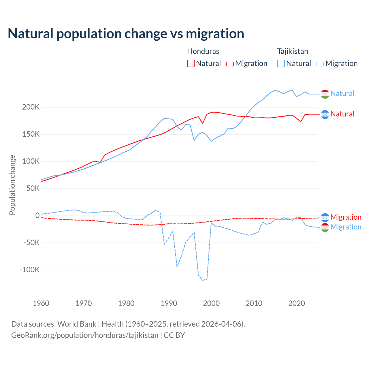 Over the last 10 years, 96.7% of the population change in Honduras is from natural causes (a gain of 1,821,125 people) and 3.29% is from migration (a loss of 61,965 people). In Tajikistan 96% is from natural causes (a gain of 2,266,045 people) and 3.95% is from migration (a loss of 93,205 people).