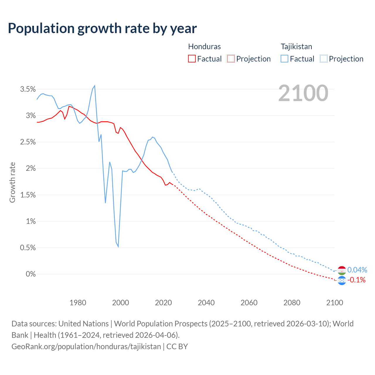 - For the last 10 years, Honduras has had an average growth rate of +1.81% per year vs +2.33% in Tajikistan.