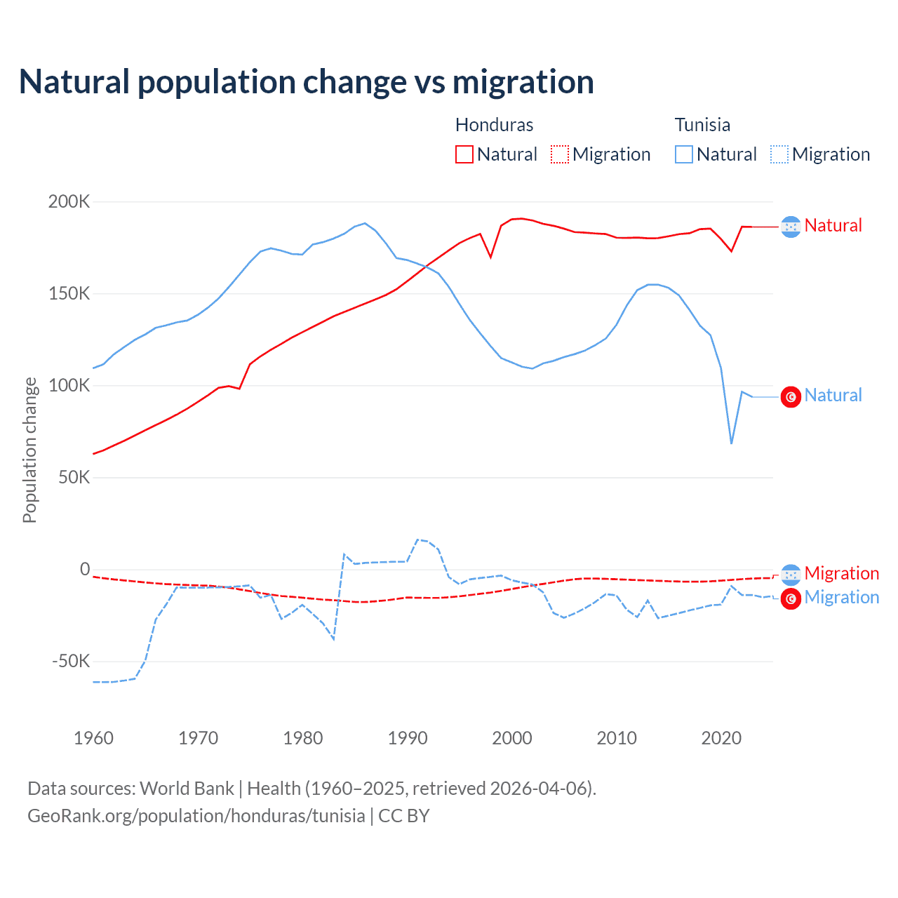 Over the last 10 years, 96.7% of the population change in Honduras is from natural causes (a gain of 1,821,125 people) and 3.29% is from migration (a loss of 61,965 people). In Tunisia 86.3% is from natural causes (a gain of 1,225,079 people) and 13.7% is from migration (a loss of 195,011 people).