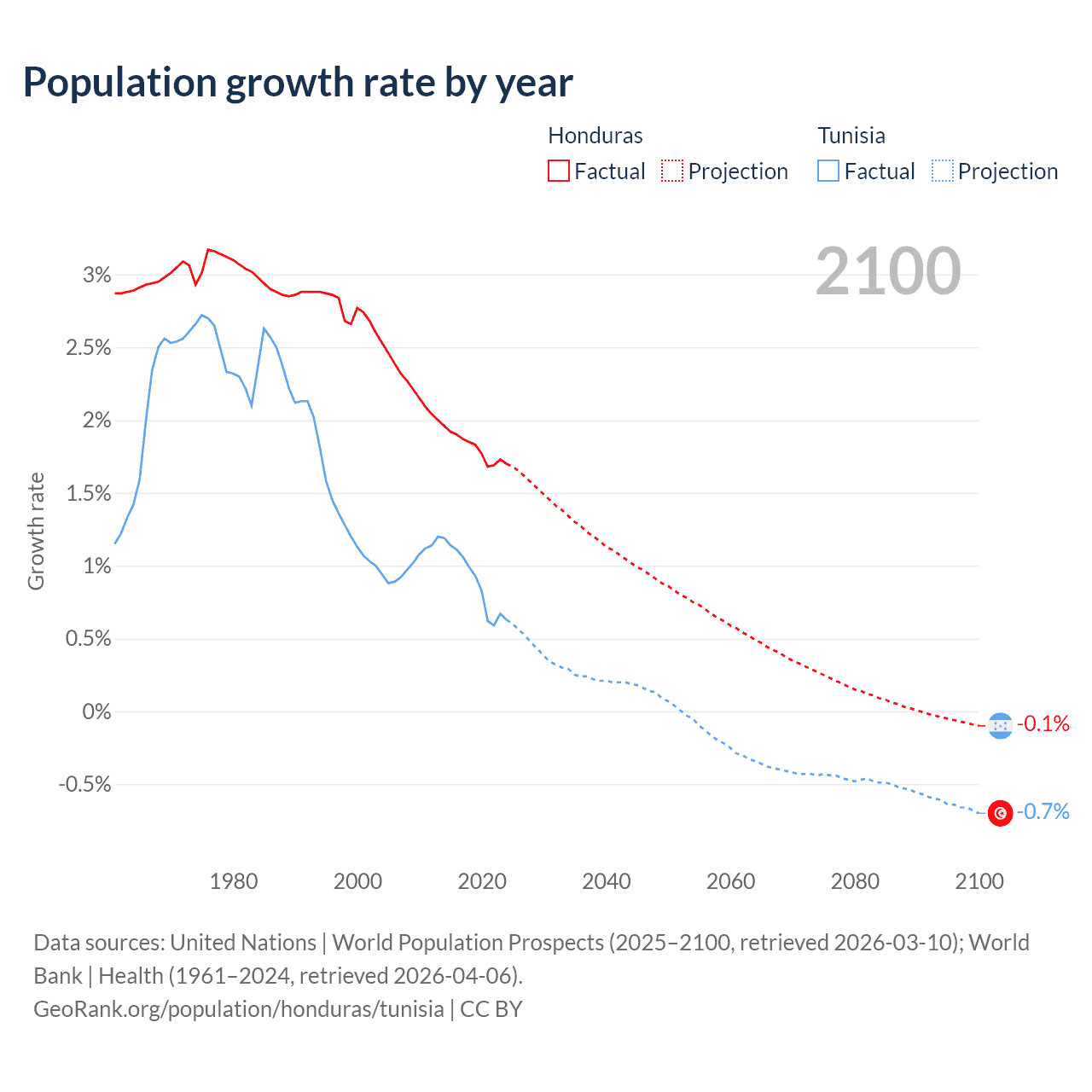 - For the last 10 years, Honduras has had an average growth rate of +1.81% per year vs +0.89% in Tunisia.