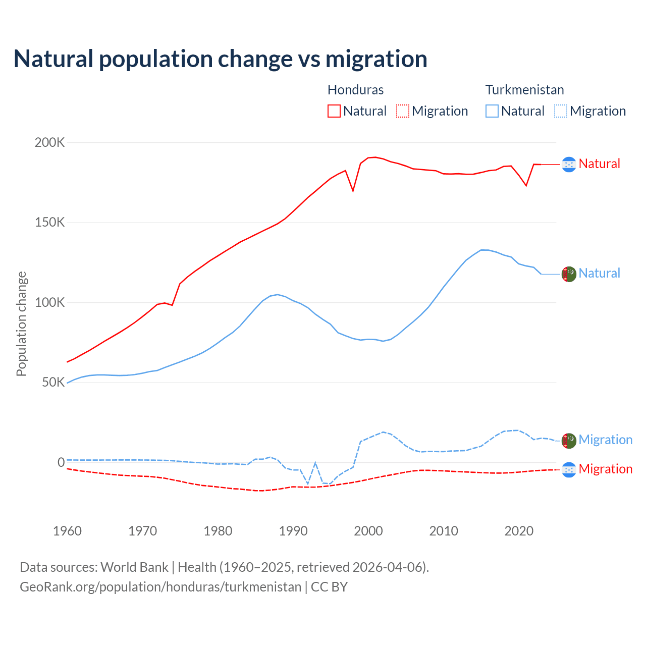 Over the last 10 years, 96.7% of the population change in Honduras is from natural causes (a gain of 1,821,125 people) and 3.29% is from migration (a loss of 61,965 people). In Turkmenistan 89.2% is from natural causes (a gain of 1,270,228 people) and 10.8% is from migration (a gain of 154,379 people).