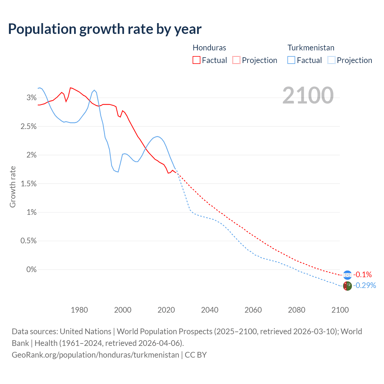 - For the last 10 years, Honduras has had an average growth rate of +1.81% per year vs +2.14% in Turkmenistan.