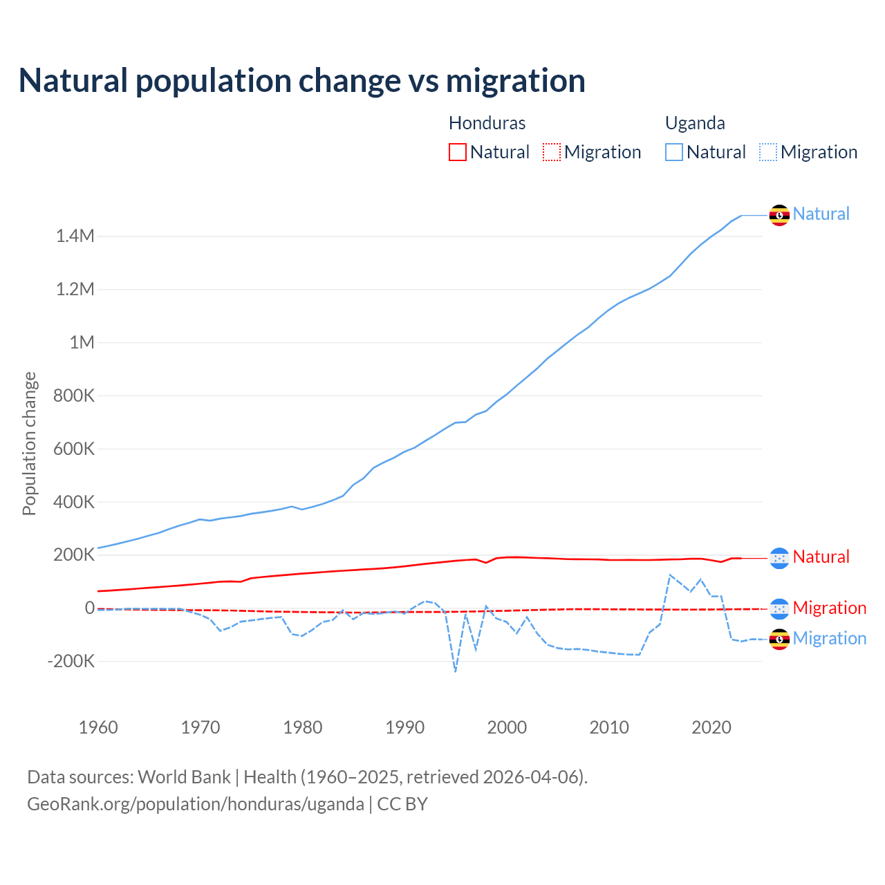 Over the last 10 years, 96.7% of the population change in Honduras is from natural causes (a gain of 1,821,125 people) and 3.29% is from migration (a loss of 61,965 people). In Uganda 99.5% is from natural causes (a gain of 13,419,712 people) and 0.53% is from migration (a gain of 71,457 people).