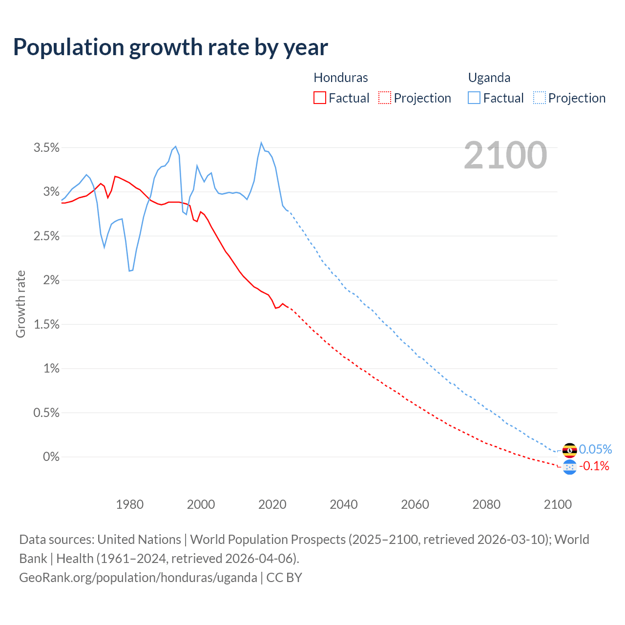 - For the last 10 years, Honduras has had an average growth rate of +1.81% per year vs +3.21% in Uganda.