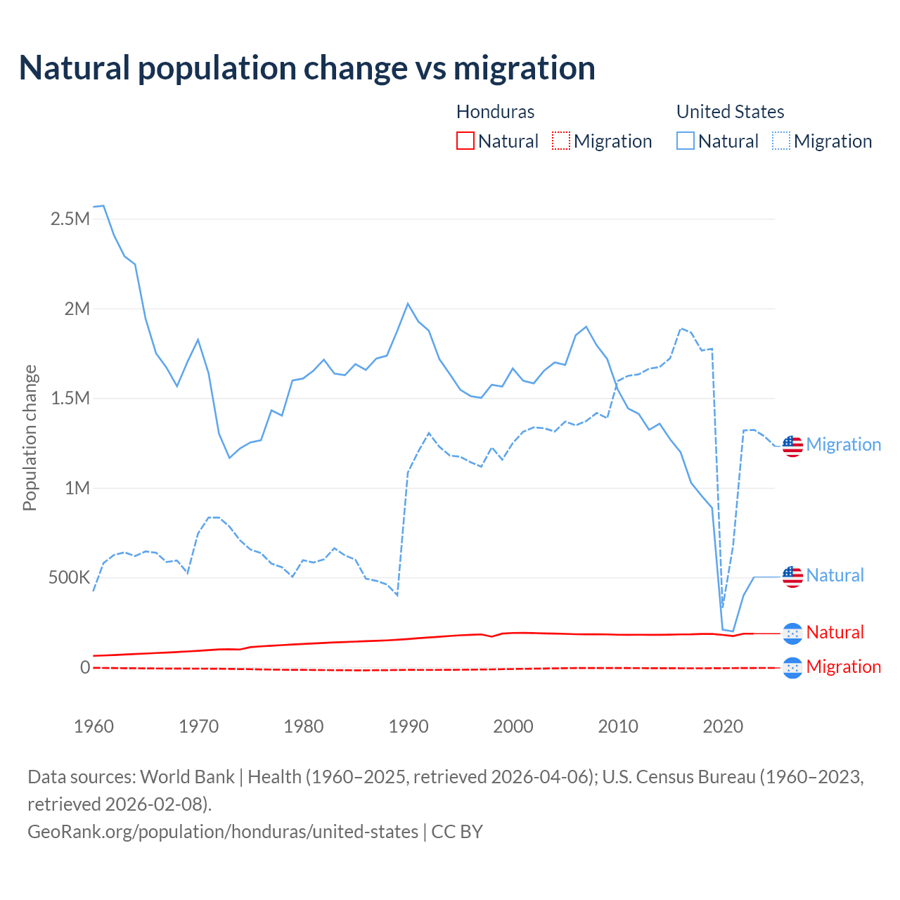 Over the last 10 years, 96.7% of the population change in Honduras is from natural causes (a gain of 1,821,125 people) and 3.29% is from migration (a loss of 61,965 people). In the United States 35.8% is from natural causes (a gain of 8,005,866 people) and 64.2% is from migration (a gain of 14,334,286 people).